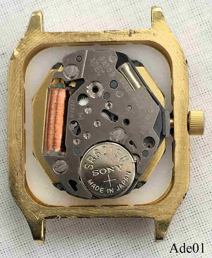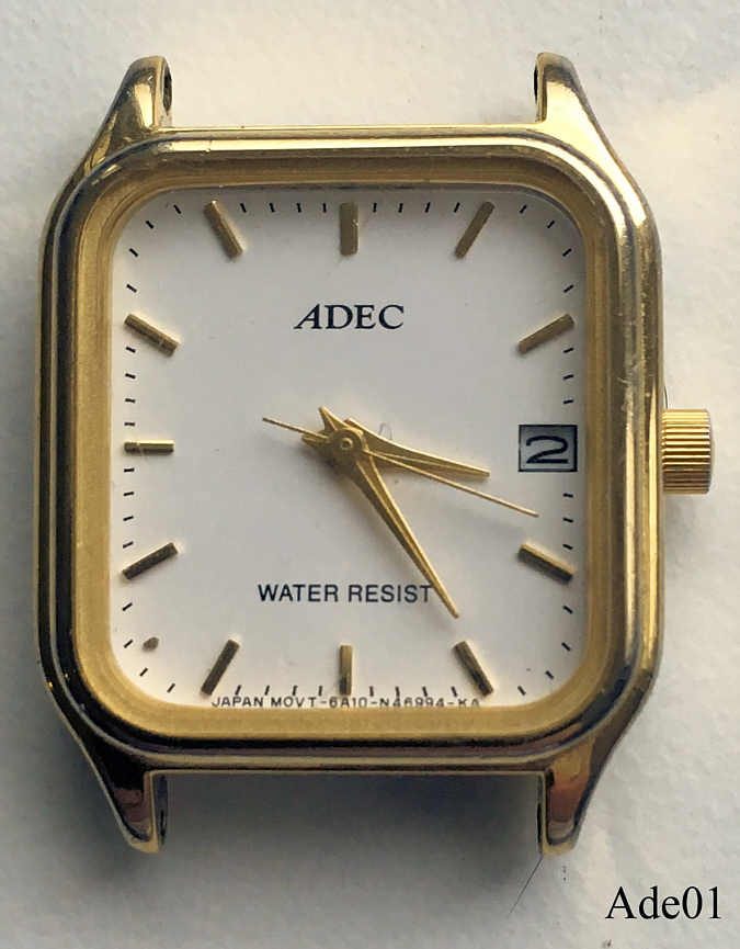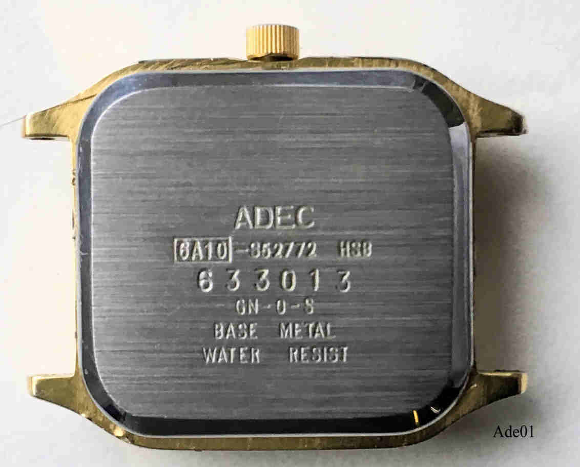 Dies ist eine Damen Quartzuhr der Marke Adec by Citizen. Weißes Zifferblatt, Kalender bei der 3. Beschriftet vorn: ”ADEC, Water Resist, Japan Movt-6A10-N48994-KA”, Rückseite: ”ADEC, 6A10-S52772 HSB, 633013, GN-0-S,Base Metal, Water Resist”, innen: “ADEC, 6A10B, unadjusted, No Jewels, Japan”. Gehäuse Base Metall, Kaliber ADEC 6A10B (Miyota 6L12).
