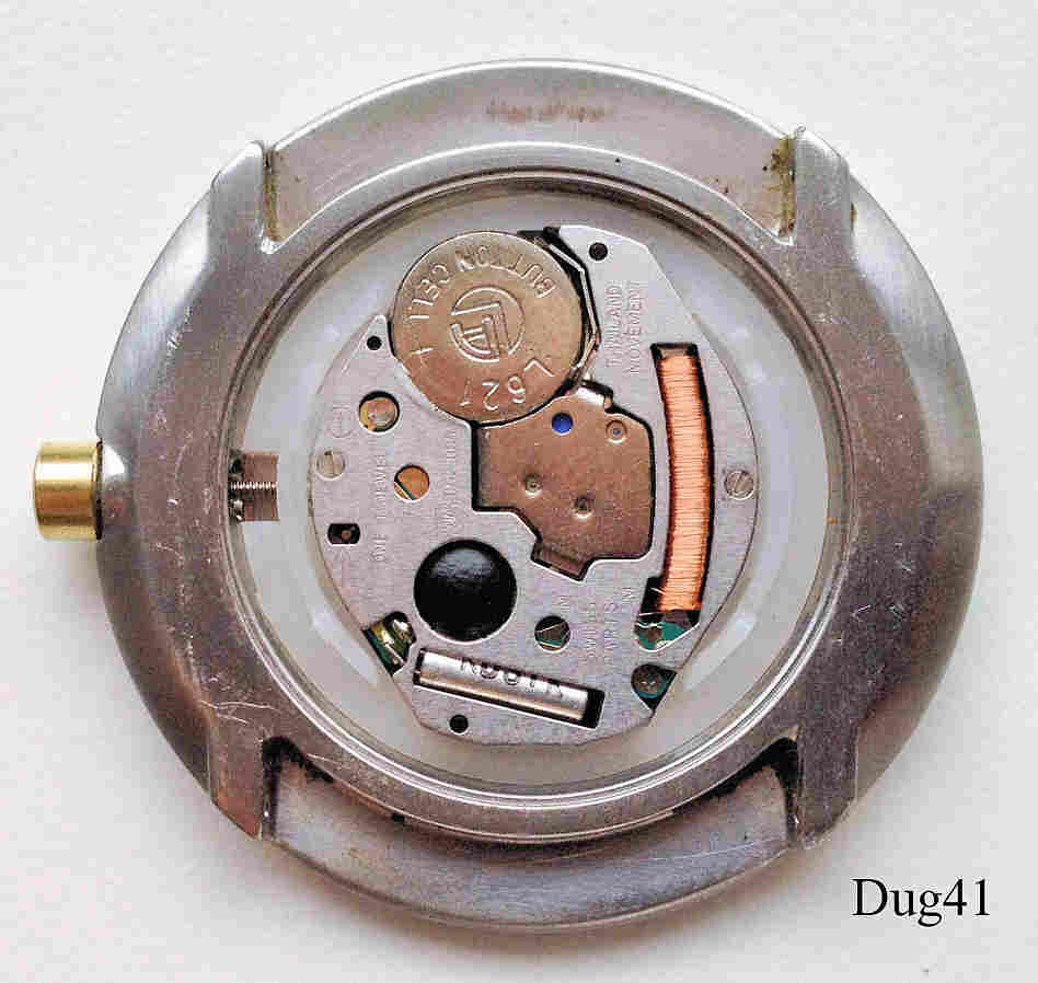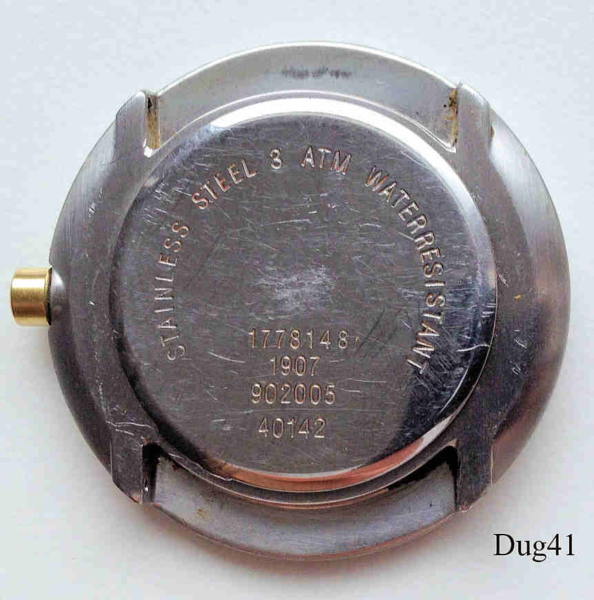 Eine Dugena Amaretta Damen Quartzuhr mit Base Metal Gehäuse und Edelstahl Boden. Beschriftung vorn: “ Dugena, Amaretta”, Hinten: ”1778148, 1907, 902005, 40142, Stainless Steel, 3 ATM, Water Resistant”, innen: ”One 1 Jewel, T, ETA 902.005, Thailand Movement, Swiss Parts”.