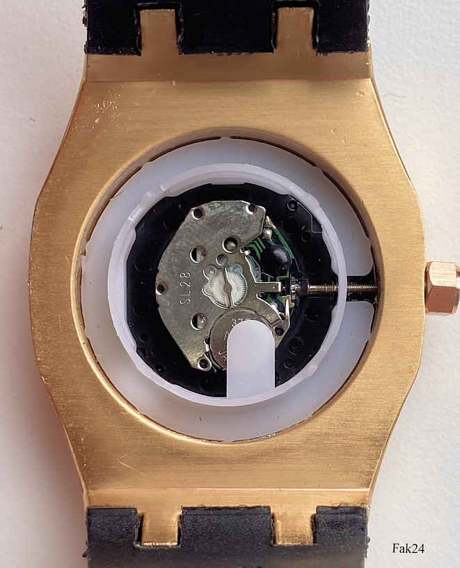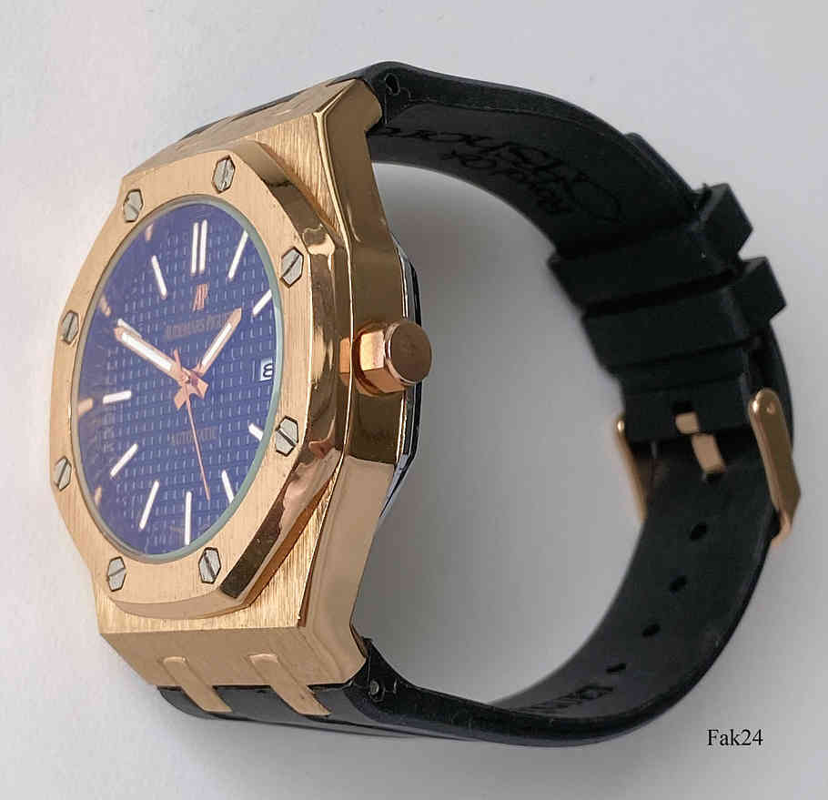This is the copy of a Audemars Piguet Royal Oak Offshore, a very simple fake. The screwheads are pressed, inside is a very cheap quartz movement Caliber Sl28. Signed front: ”Audemars Piguet, Automatic”, hinten: “AP, Royal Oak, Offshore, No 0732, H98569”. Black rubber band.