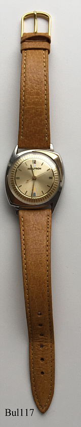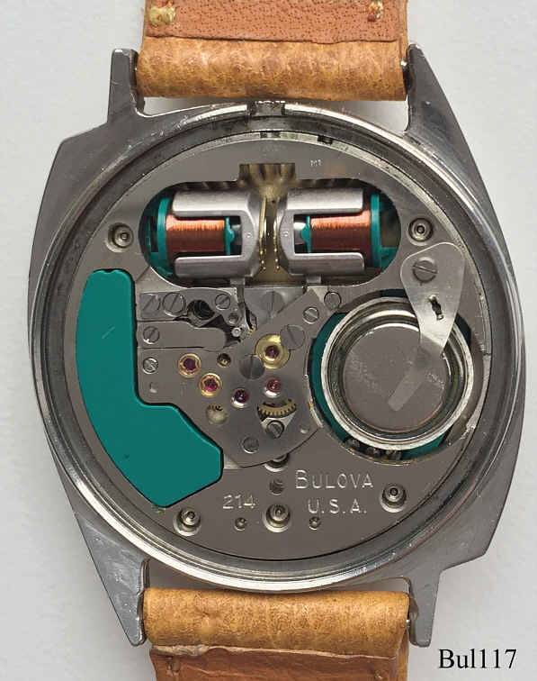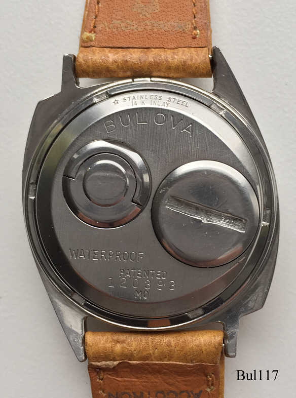 Eine Bulova 214 mit asymmetrischem Edelstahlgehäuse, Beschriftet hinten: “BULOVA, Waterproof, Patented, 120393, M0”, innen: “Bulova, 214, USA, Pat.:2.971.323, M1”, Caliber 2140, Herstelldatum 1960 (M0), verschraubter Boden, Einstellung über Stellring an der Rückseite, hier noch die erste Version mit Arretierung. Hellbraunes Bulova Lederarmband.