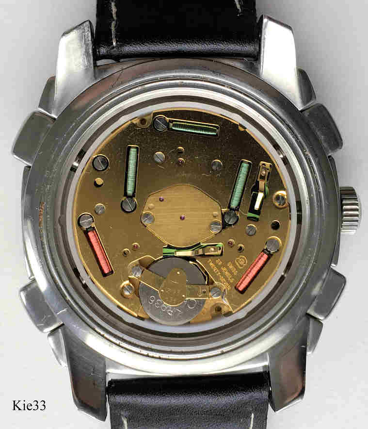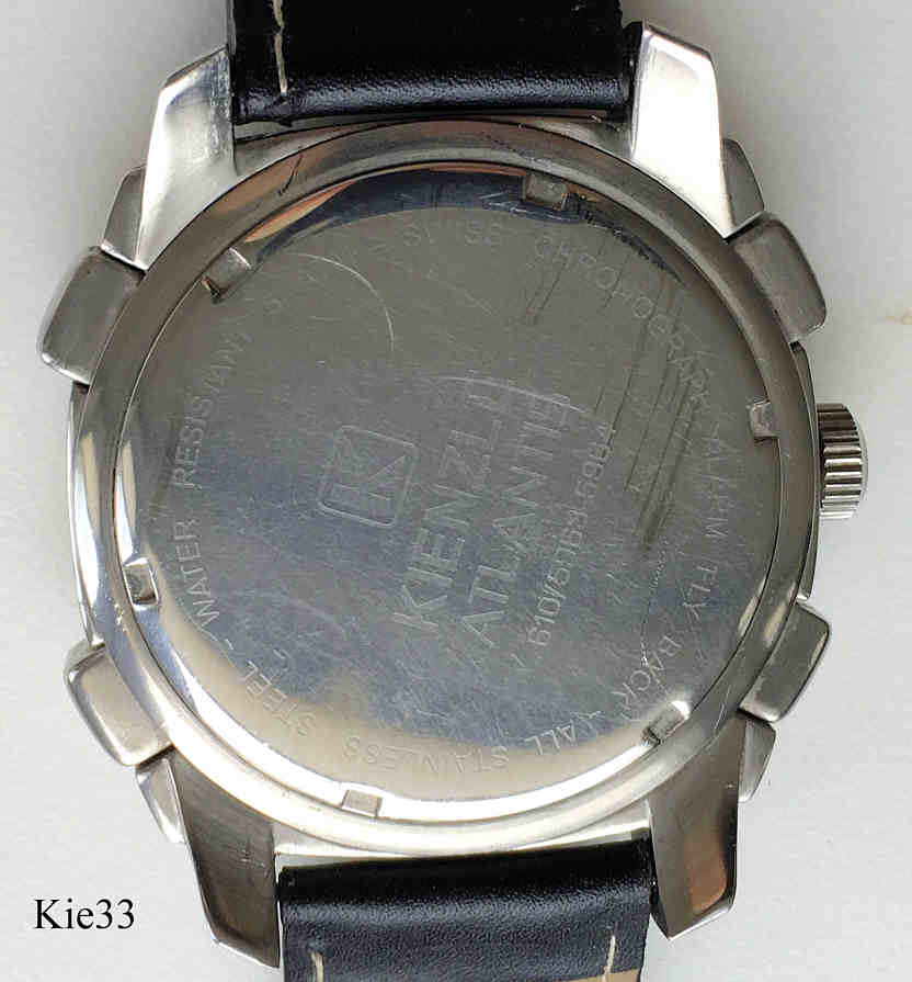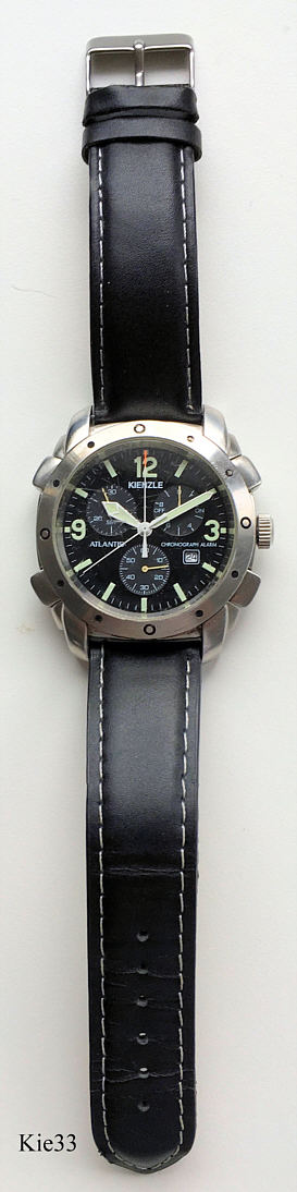 Dies ist ein Atlantis Flyback Alarm Chronograph von Kienzle. Kalender bei der 4. Beschriftet vorn: “Kienzle, Atlantis, Chronograph Alarm”, Rückseite: ”Kienzle Atlantis, All Stainless Steel, Water Resistant 5 ATM Swiss, Chronograph, Alarm, Fly Back”, innen: “ ETA, Swiss, 27 Jewels, Twenty Seven, 251.242 ”. Gehäuse Stainless Steel, schwarzes Lederarmband.