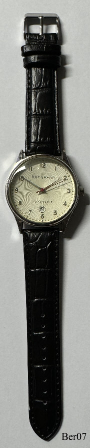 Dies ist eine Bergmann Automat 2, Datum bei der 6, Nr. 0309,. beschriftet vorn: ”Bergmann, Automat 2”, hinten: ”Automat, Nr. 0309, Bergmann-Uhren.de, AC, Automat 2”, innen: ”Bergmann 411”. Gehäuse Edelstahl, Glasboden, hellbeiges Zifferblatt, schwarzes Lederarmband. Kaliber unbekannt.