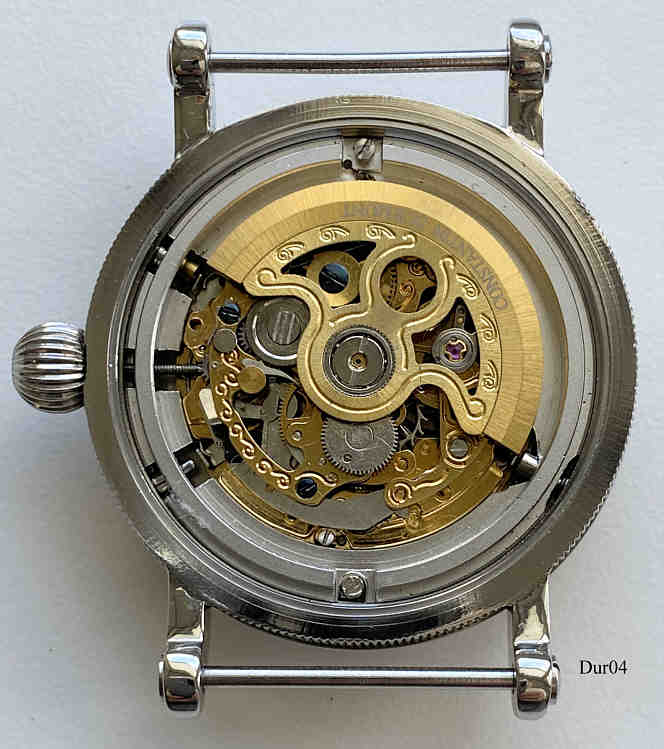 Diese Skelett Automatic Uhr von Constantin Durmont, hat einen Glasboden, ein Automatic Werk und ein Skelettiertes Zifferblatt. Es gibt eine Anzeige für Tag, Monat und GMT, sowie eine Anzeige für das Datum mit ebenfalls Skelettierten Ziffern. Großes Edelstahl Gehäuse. Beschriftung vorn: ”Constantin Durmont, Automatic”, hinten: ”3 ATM Water Resistant, Constantin Durmont, Automatic”. Die gleiche Uhr ist noch einmal hier.