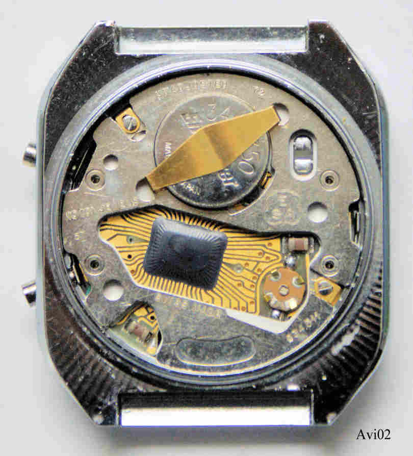 Dies ist eine Avia LCD Quartz, eine Digitaluhr mit LCD Display: Zeit, Sekunden, Tag. Beschriftung vorn: ”AVIA, Quartz, Swiss Made”, hinten: ”Swiss Made, Stainless Steel Back, Water Resistant, 9346-0518”, innen: “Unadjusted 72, No (0) Jewels, ESA 934.511, Swiss Made”, Base Metal Gehäuse, Stainless Steel Back.