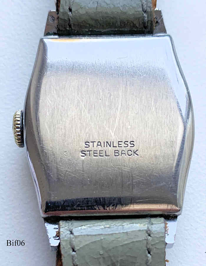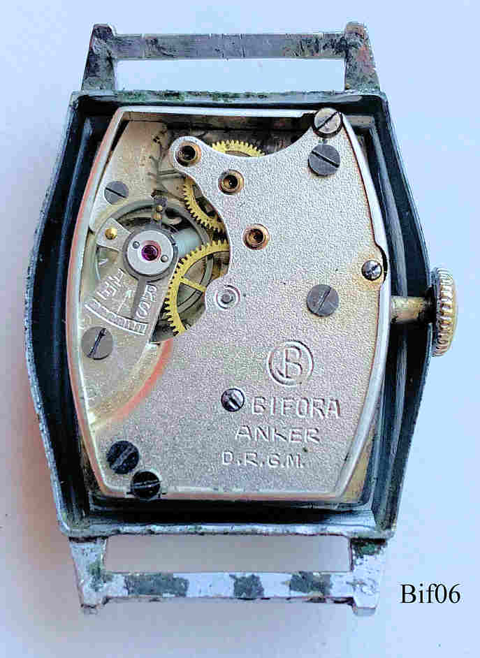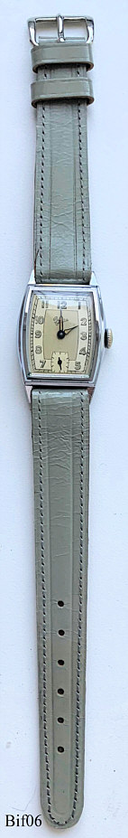 Dies ist eine Bifora Handaufzugs Uhr mit dem ersten deutschen, wahrscheinlich sogar weltweiten, Armbanduhren Werk, das B2025. Hergestellt von 1928 - 1940. Kleine Sekunde bei der 6. Beschriftet vorn: ”BIFORA”, hinten: ”Stainless Steel Back”, innen: “B, Bifora, Anker, D.B.G.M.”. Kaliber: Bifora B2025, graues Lederband an festen Bundstegen.