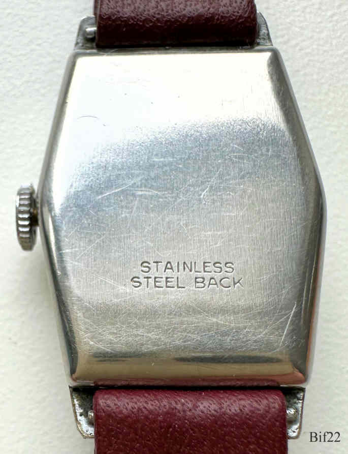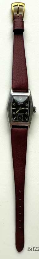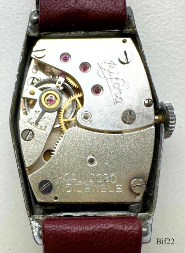 Dies ist eine Bifora Handaufzugs Uhr mit der weiter Entwicklung des B2025, dem 2030. Hergestellt von 1940 - 1953. Kleine Sekunde bei der 6. Beschriftet vorn: ”BIFORA, Stoßsicherung, 15 Rubies”, hinten: ”Stainless, Steel Back”, innen: “Bifora, Cal 2030, 15 Jewels.”. Kaliber: Bifora B2030, braunes Lederband an festen Bundstegen.