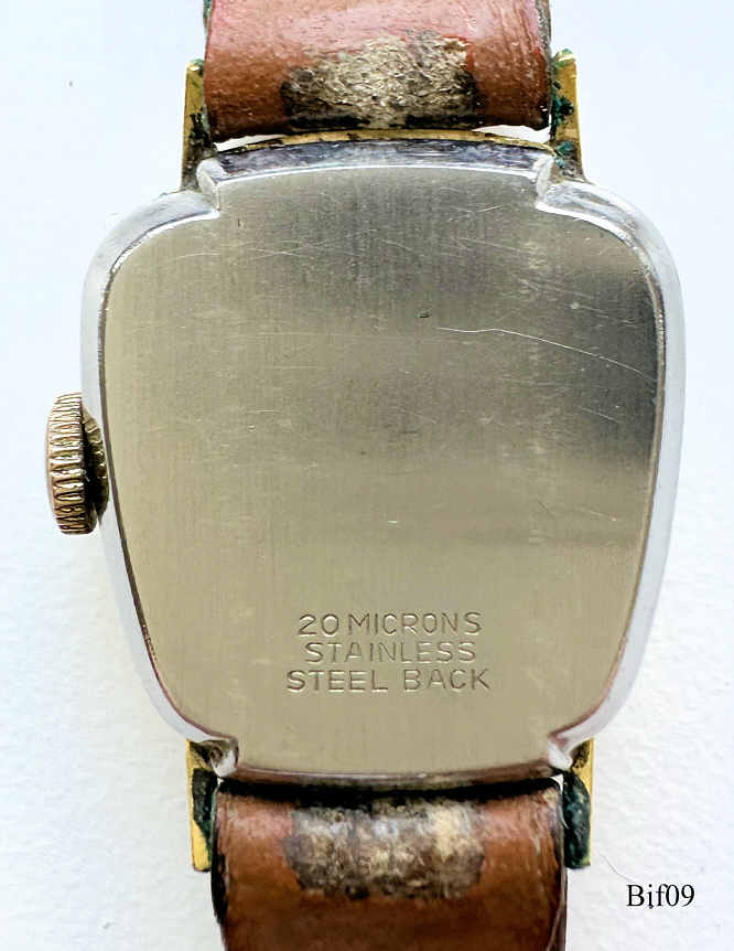 Dies ist eine Bifora Damen Handaufzugs Uhr mit dem Bifora 55 Kaliber. Beschriftet vorn: ”BIFORA, 17 Rubies”, hinten: ”20 Microns, Stainless Steel Back”, innen: “55”. Kaliber: Bifora 55, Braunes Lederband.