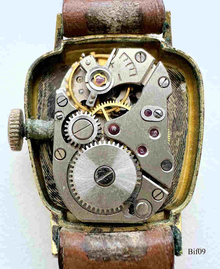 A Bifora ladies handwind watch with the Bifora 55 caliber. Signed front: ”BIFORA, 17 Rubies”, back: ”20 Microns, Stainless Steel Back”, inside: “55”. Caliber: Bifora 55, brown leather band.