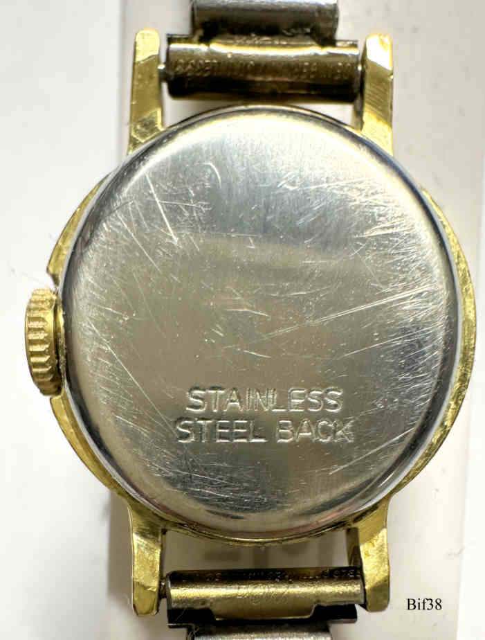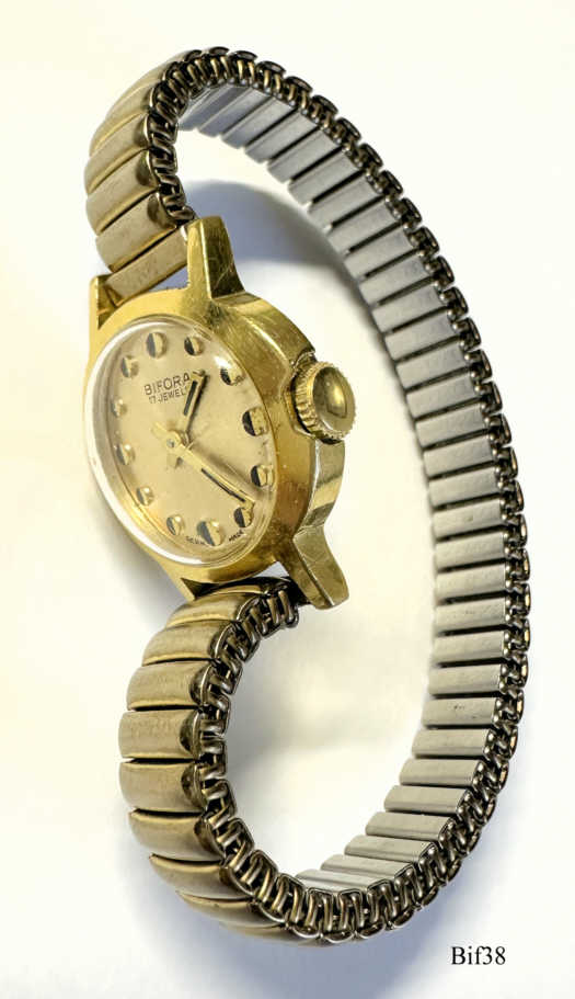 Dies ist eine Bifora Handaufzugs Uhr mit dem Bifora 691 Werk, Modell “Day/Night”. Beschriftet vorn: ”BIFORA, 17 Juwels, Germ. Made”, hinten: “Stainless Steel Back”, innen: “€¯B, 691”, Kaliber: Bifora 691, FixoFlex Band. Die Bezeichnng Day/Night bezieht sich auf die Punkte auf dem Zifferblatt.