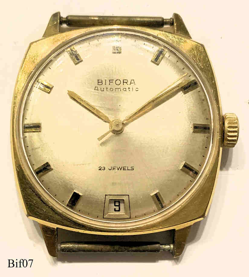 Dies ist eine Bifora Herren Automatic Uhr mit dem B910A Kaliber. Zentralsekunde, Beschriftet vorn: ”BIFORA, Automatic, 23 Jewels”, hinten: ”Antichock, Waterprotected, Antimagnetic Steel Back”, innen: “B, 910”. Kaliber: Bifora B910A. .