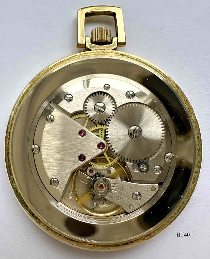Eine Bifora Taschenuhr Modell Stratos mit dem Kaliber Bifora 130. Beschriftet vorn: “Bifora, Stratos, 17 Rubis, Bishock”, hinten: “Zum 50 Jährigen Sängerjubiläum 28.02.1971, Logo Deutscher Sängerbund”, innen: “B, 130”. Base Metall Gehäuse, 20µ vergoldet. |
