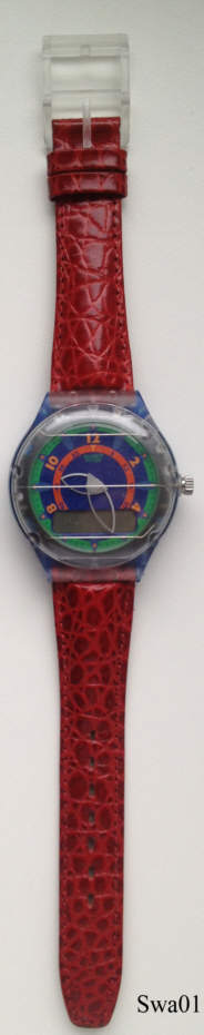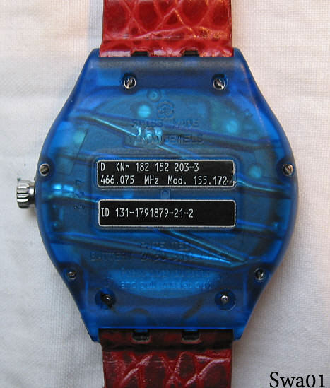 Eine Swatch ”The Beep” mit eingebautem Pager. Beschriftet vorn: “Swatch, Swiss”, hinten: “€Swiss Made, 10 Jewels, patented, Battery 24,50- 3,00 Li 3V, press both buttons and pull wristlet out, D KNr 182 152 203-3, 466,075 MHz Mod. 155.172, ID 131-1791879-21-2”. Im futuristischen Zifferblatt ist bei der ”6” ein LCD Display integriert, das die Rufnummer anzeigt, die durch den Pager übermittelt wird. Kunststoff Gehäuse mit Kunstleder Armband, die Drähte auf dem Zifferblatt dienen als Antenne.