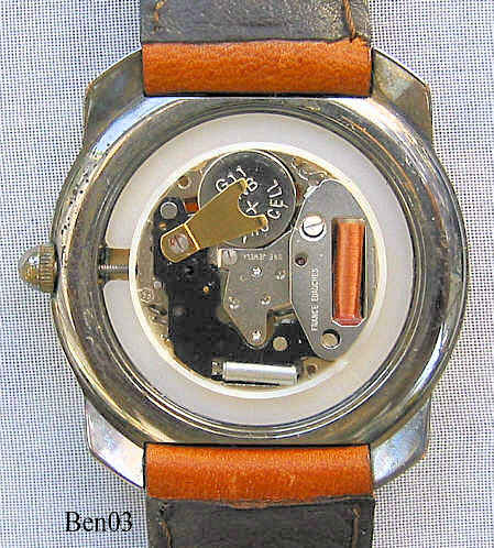 Ein Benetton by Bulova Retro Modell, Beschriftet vorn: ”United Colors of Benetton by Bulova”, hinten: ”United Colors of Benetton by Bulova, Stainless Steel Back, Water Resistant, Base Metal Bezel, Mod. Dep.”, Braunes Lederarmband mit neutraler Schließe.
