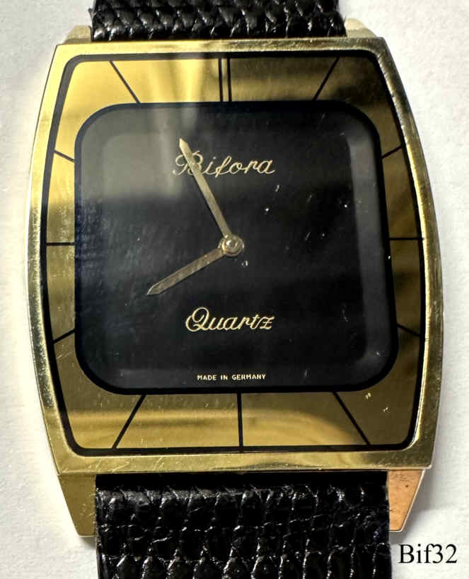 This is a Bifora quartz watch, using the slim-line movement B17 of Bifora, the alignment is at the back. The watch has a very attractive golden case, and is 3,2mm thick. Signed front: ” BIFORA, Quartz, Made in Germany”, back: ”Bifora, Made in W. Germany, Stainless Steel Back, Base Metal Gold Plated”, inside: “B, Two Jewels, Unadjusted, W.Germany” Caliber: Bifora B17.