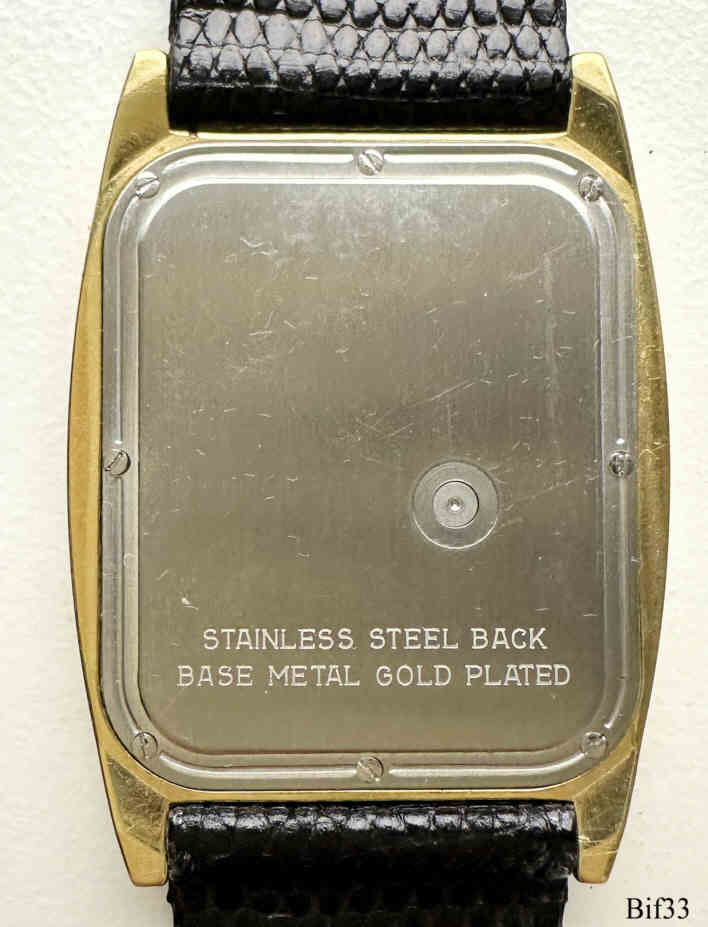 Dies ist eine Bifora Quartz Uhr mit dem Slim Line Werk B17, der Stellknopf ist an der Rückseite. Die Uhr hat ein sehr ansprechendes vergoldetes Gehäuse und ist  3,2mm dick. Beschriftet vorn: ”BIFORA, Quartz”, hinten: ”Stainless Steel Back, Base Metal Gold Plated”, innen: “B, Two 2 Jewels, Unadjusted, W. Germany”.  Kaliber: Bifora B17.