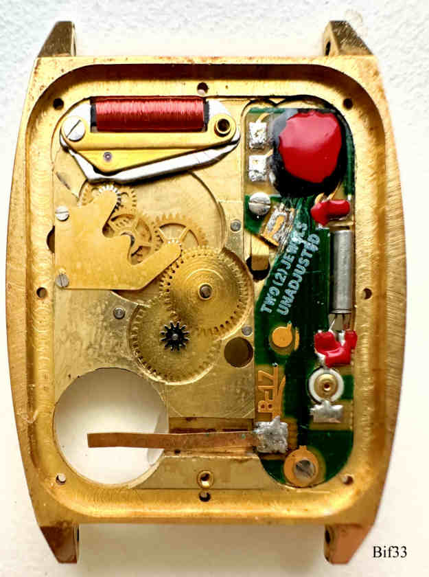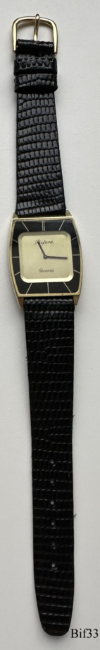 This is a Bifora quartz watch, using the slim-line movement B17 of Bifora,  the alignment is at the back. The watch has a very attractive golden case, and is 3,2mm thick. Signed front: ” BIFORA, Quartz”, back: ”Stainless Steel Back, Base Metal Gold Plated”, inside: “B, Two Jewels, Unadjusted, W.Germany”  Caliber: Bifora B17.