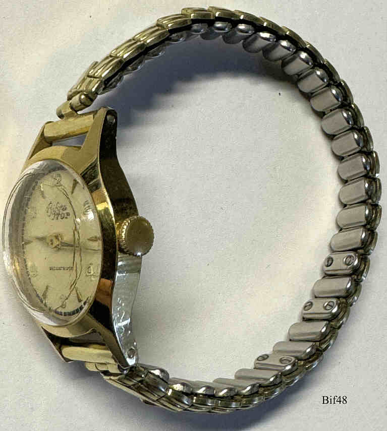 Dies ist eine Bifora Handaufzugs Uhr mit dem Bifora 934 Werk, an den Zeitgeschmack angepasst durch eine Zentral Sekunde. Dafür wurde die Kaliber Bezeichnung durch ein SC modifiziert. Beschriftet vorn: ”¯BIFORA, Top, Shockproof”, hinten: ”Stainless Steel Back”, innen: ”¯B, 934 SC”,¯ Kaliber: Bifora 934 SC, 1-61 Elasta-Luxus Armband