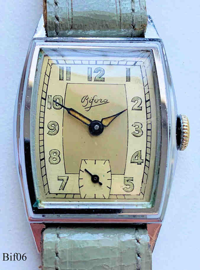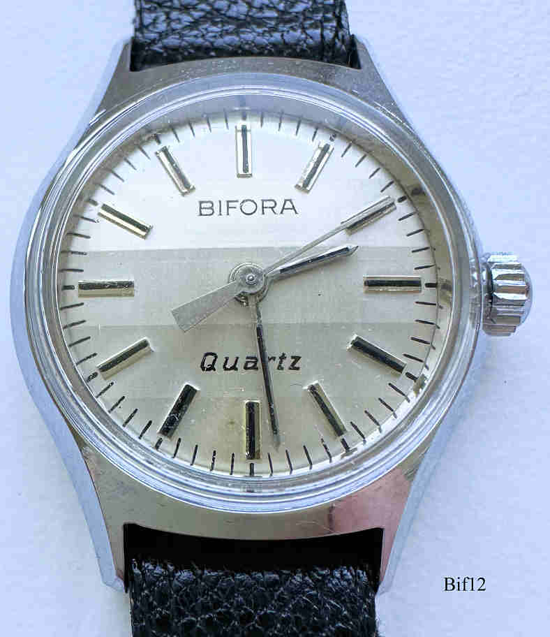The first german watch movement After years of pioneer work Josef Bidlingmaier could in 1928 introduce the Caliber B2025 as the first self developed and manufactured watch movement. It is the first form movement specially for watches built in Germany. Also it is the first watch movement with anchor lever of german production. On the ¾ bridge of the movement was the signature ”BIFORA” (BI= Bidlingmaier, FOR= Formwerk, A= Ankerhemmung) and ”D.R.G.M.“ (Deutsches Reichs-Gebrauchsmuster). In 1934 the trade mark ”Bifora” was registered and the company renamed in ”Bifora-Uhren J. Bidlingmaier Gesellschaft mit beschränkter Haftung”. The company J. Bidlingmaier developed to one of the leading German watch manufacturers and the watches had an excellent image. Bimag - the first german automatic movement 1951 the caliber 103 SA was introduced as the first German automatic movement. 1962 Bifora introduced the first German ladies automatic caliber, caliber 70 with 7 ¼ lines, to the market. In the same year also a new Bifora-Automatic mens watch was introduced. The caliber 910 was based on an inexpensive pole construction. Chronometer Bifora ”Unima” 1955 the caliber 120 in the form ”Unima” was presented as a very successful handwind-chronometer movement. The Bifora ”Unima”-Chronometer were besides the Chronometers of Junghans and Laco the top products of German watch production. Quarzwatches Already in 1967 working prototypes of the electromechanical movements B8 and B9 were shown, but only in 1971 the calibers B10/B11 were functional electromechanical products in serial production. Bifora then could show an own quartz movement in 1973 with the caliber B12. A lot of parts of the B10/B11 (i.e. plates and bridges) could be reused. With the ”flat-line” and the calibers B17/B18 Bifora could then in 1977 show the worldwide slimmest quartzwatch with a hight of 3,0-3,2 mm, where the case and basetplate were produced from one piece. The end Josef Bidlingmaier died on 20. January 1967 and his two sons took over the management of the company. Regardless of massive personnel cut, in 1977 with in the end 270 workers they had to claim bankrupt. 1978 the former repräsentative of the company in middle east, the India high merchant Hiranand Gajria, took over Bifora. The produktion in Germany stopped finally in 1983and the factory was closed down. Also in India the watch production was finally closed down in the 1990s. The new aera In 2011 a small team started again by founding the ”Bifora Uhren-Manufaktur GmbH”. They want to produce high quality mechanical watches in the old tradition but following the modern demand. And so they could show in november 2014 the JB-60, the first Bifora-watch since 30 years. The name reminds at the founder Josef Bidlingmaier and the edition of 60 pieces. 60 original caliber 130 from 1965 were used. They have been generally fixed and exceptionally refurbished and polished. All parts of the watch, as of their pretention, are produced in Germany and Switzerland. The case for example is produced in Pforzheim, the band in Augsburg. The dial and hands are made in Switzerland. The business model did not succeed and was closed in a friendly way. The brand name stayed with the former owner. the 60 watches were sold with the assistance of the Bifora Freundeskteis e.V. Until today exists a sale office of the indian owners of Bifora in the former manufactoring site and offers modern Bifora watches of the indian manufacturing. Brand museum 2009 the association ”Bifora Freundeskreis e.V.” was founded. Since 2014 a museum managed by the Bifora Freundeskreises e.V. was founded in a side wing of the former manufacturing site and documents the companys history by i.e. all ever built movements and many other artefacts. To maintain and keep the museum alive every now and then small series of watches from still existing new old stock movements are created for specific Schwäbisch Gmünd city events. They are remainders of the production of 1980 and are combined with new cases and dials designed and manufactured by the Bifora Freundeskreis e.V..