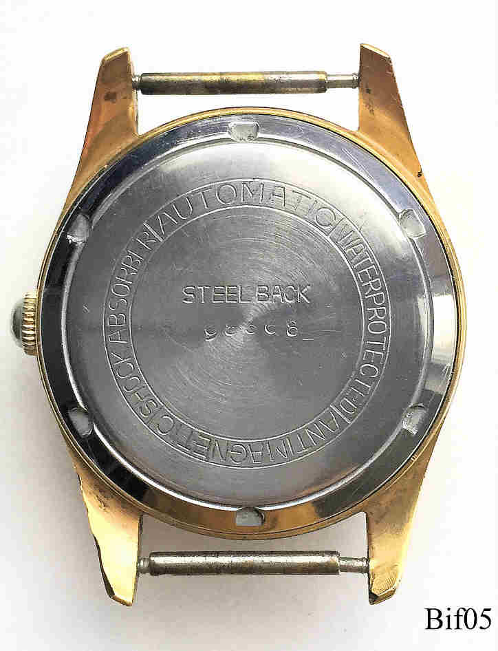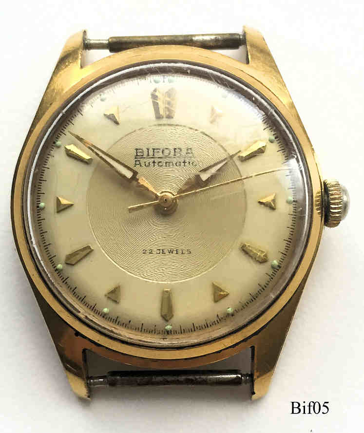 Dies ist eine Bifora Automatic mit dem Kaliber 111A. Dies Kaliber wurde von 1953 bis 1956 gebaut. Die Uhr hat ein vergoldetes Gehäuse mit chremefarbenem Zifferblatt. Beschriftet: ”BIFORA, Automatic, 22 Jewels” hinten: ”Steel Back, 98568, Waterprotected, Antimagnetic, Shockabsorber, Automatic”, innen: “Automatic, B, 111”. Kaliber: Bifora 111A