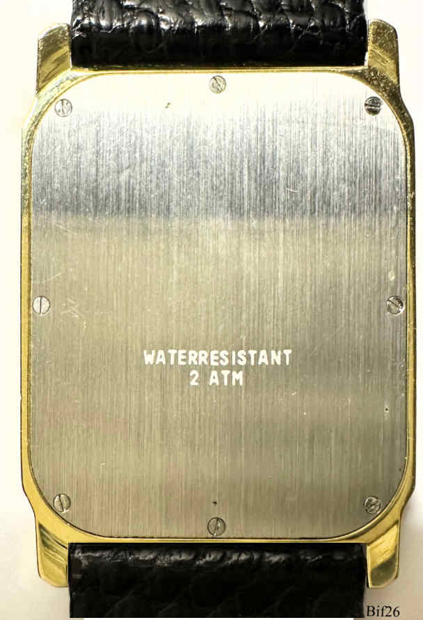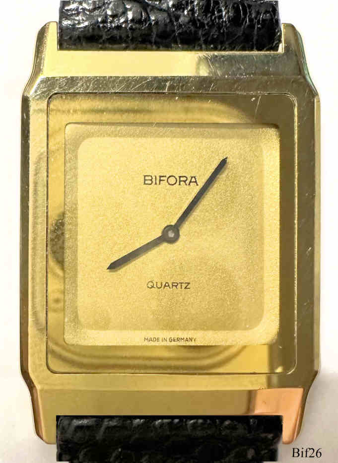 This is a Bifora quartz watch, using the slim-line movement B18 of Bifora. This B18 movement is a separate one, the alignment is at the side. The watch has a very attractive golden case, and is 3,0mm thick. Signed front: ” BIFORA, Quartz, Made in Germany”, back: ”Bifora, Made in W. Germany, Stainless Steel Back, Base Metal Gold Plated”, inside: “Two Jewels, Unadjusted” Caliber: Bifora B18.