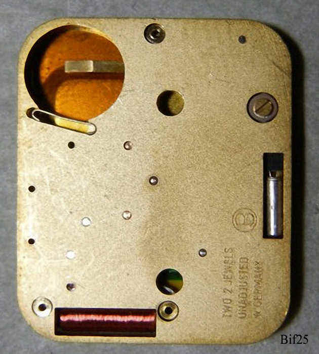 This is a Bifora quartz watch, using the slim-line movement B18 of Bifora. At the market placement it was the slimmest watch in the world with 3,0mm.. This B18 movement is a separate one, the alignment is at the side. The watch has a very attractive golden case. Signed front: ” BIFORA, Quartz” back:”Two Jewels, Unadjusted, W. Germany, B”, Caliber: Bifora B18”,