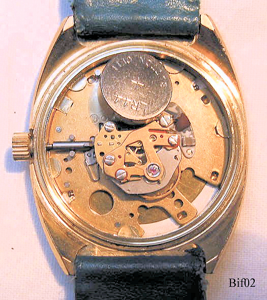 Dies ist eine Bifora electronic, sie verwendet ein sehr eigenwilliges, kleines Werk von Bifora. Die Unruhe schwingt hier mit der unglaublichen Geschwindigkeit von 36000 Halbschwingungen pro Stunde, d.h. 10 Halbschwingungen pro Sekunde! Dadurch erscheint der Lauf des Sekundenzeigers wie bei der Stimmgabeluhr nicht Schrittweise sondern kontinuierlich. Die Uhr hat ein sehr ansprechendes vergoldetes Gehäuse mit grünem Lederarmband. Beschriftet: ”BIFORA, electronic, 36000” hinten: ”Stainless Steel Back, Waterprotected, Antimagnetic”, Kaliber: Bifora B10