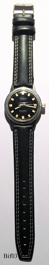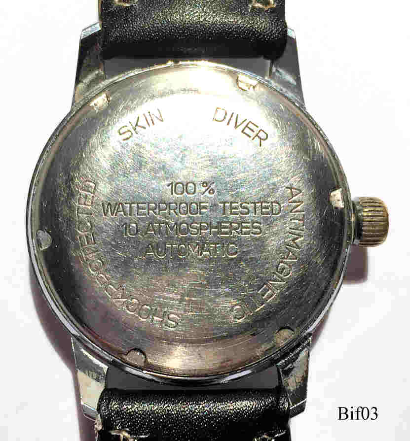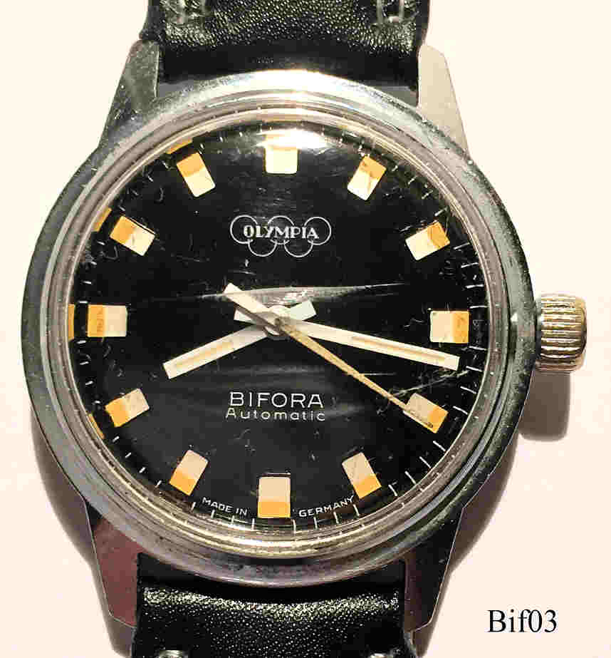 Dies ist eine Bifora Olympia Automatic Uhr mit dem Bifora 910 Automatic Werk. Beschriftet vorn: ”OLYMPIA, BIFORA, Automatic, Made in Germany” hinten: ”Skin Diver, Antimagnetic, Shockprotected, 100% Waterproof tested, 10 Atmospheres, Automatic”, Kaliber: Bifora 910A, schwarzes Lederband.