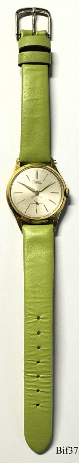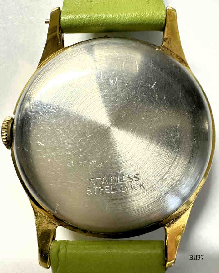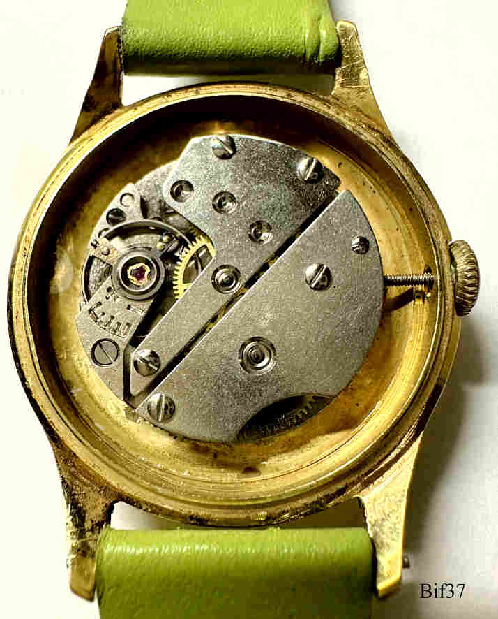 Dies ist eine Bifora Handaufzugs Uhr, Modell Top, mit dem Bifora 934 Werk. Beschriftet vorn: ”BIFORA, Top, Shockproof”, hinten: ”Stainless Steel Back”, innen: “B, 934”. Kaliber: Bifora 934, Grünes Lederband.
