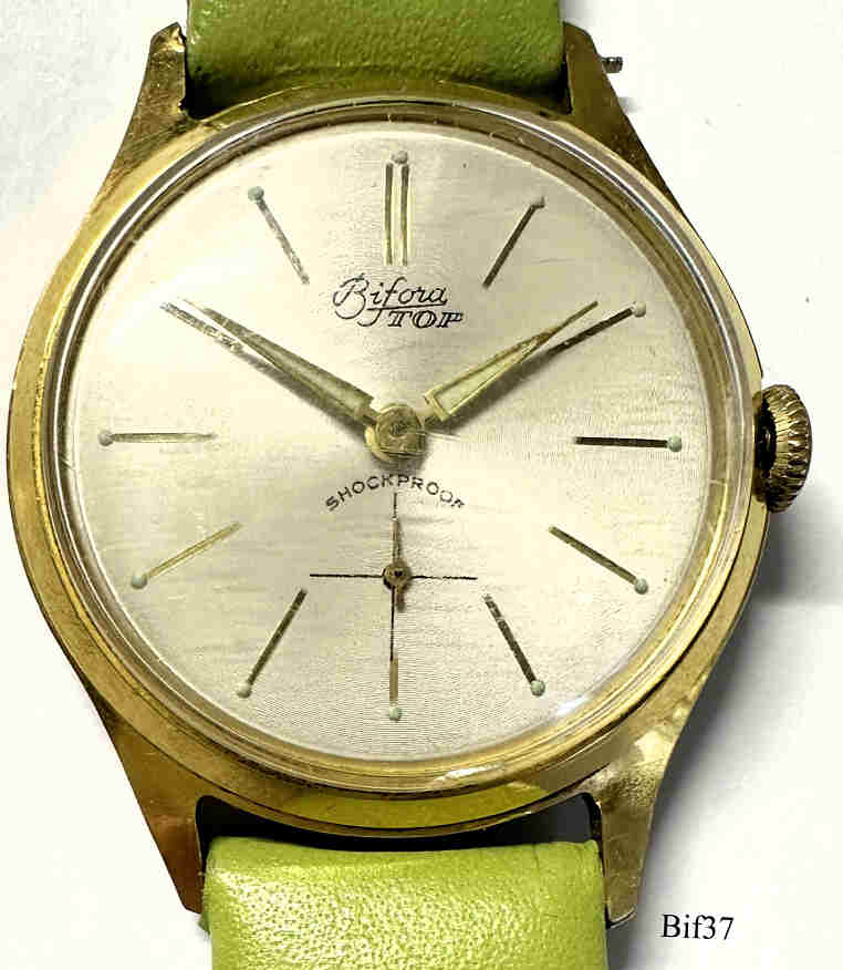 A Bifora handwind watch, model Top, with the Bifora 934 movement. Signed front: ”BIFORA, Top, Shockproof”, back: ”Stainless Steel Back”, inside: “B, 934”. Caliber: Bifora 934, green leather band.
