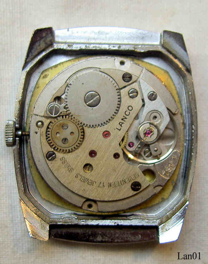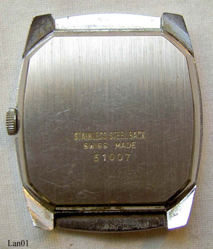 Dies ist eine einfache Lanco Handaufzugsuhr mit 17 Steinen. Inschrift: “LANCO, 17 Jewels, Incabloc”, hinten: ”Stainless Steel Back, Swiss Made, 51007”, innen: “LANCO, 751-1, seventeen Jewels Swiss”. Kaliber Lanco 751-1