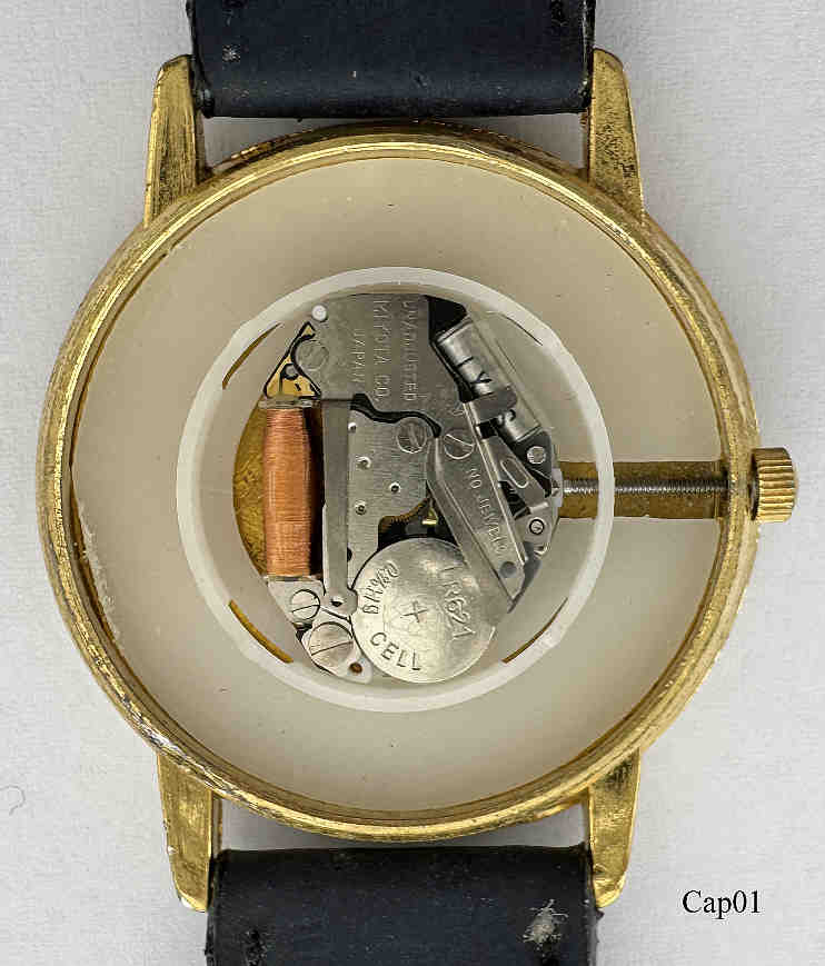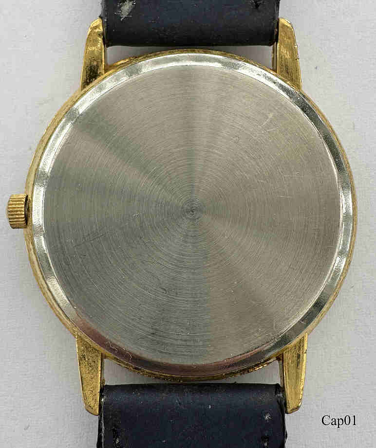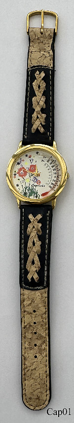 A unique interesting quartz watch with alcohol filled glas thermometer in the dial. Signed front: ”Capricho, thermometer scale in Fahrenheit and celsius”, back: ” “, inside: ”Unadjusted, Miyota Co., Japan, No Jewels”, Flower decor in the dial, very nice country type leather band, gold plated case.