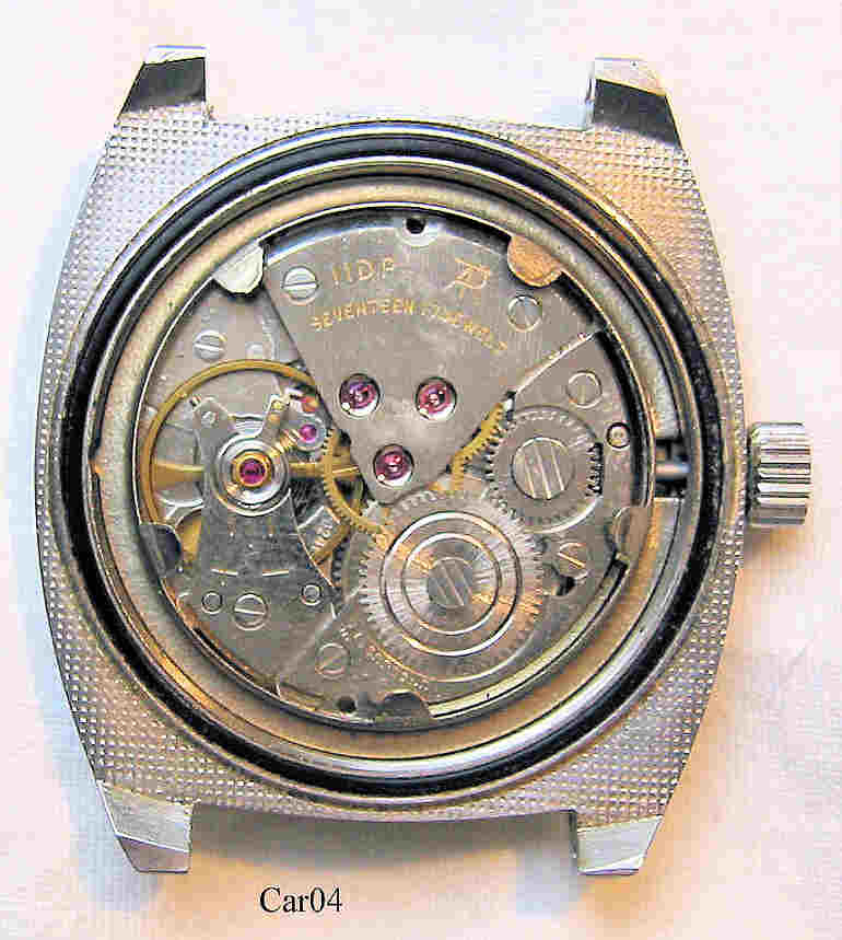 Dies ist eine Bulova Caravelle Handaufzugs Uhr, Beschriftet vorn: “Caravelle, Water Resistant”, innen: “11DP, seventeen 17 Jewels”, hinten: ”Caravelle, Shock Resistant, Water Resistant, Antimegnetic, Stainless Steel case, Base Metal Bezel Ring, N7”. Herstellung 1977 (N7).
