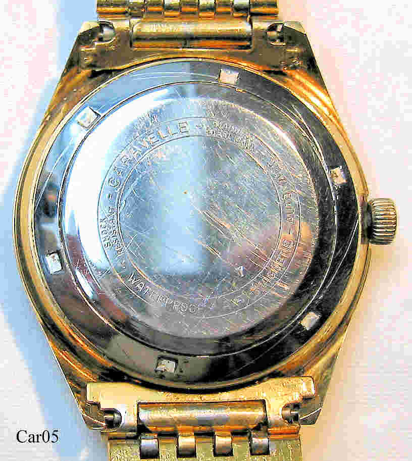 A Caravelle Automatic watch of Bulova in goldplated case (20 micron), 21 Jewels, Signed front: ”CARAVELLE, 21 Jewels, Automatic”, Inside: ”M7, Caravelle Watch, 11OZACB, Twentyone 21 Jewels Swiss”, back: ”CARAVELLE, Stainless Steel Back, Waterproof-Antimagnetic-Automatic, Shock Resistant”, Caliber 11OZACB, date of production 1967 (M7). Date and day at 3.