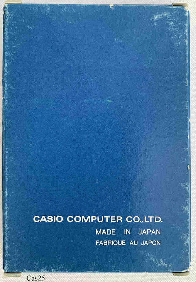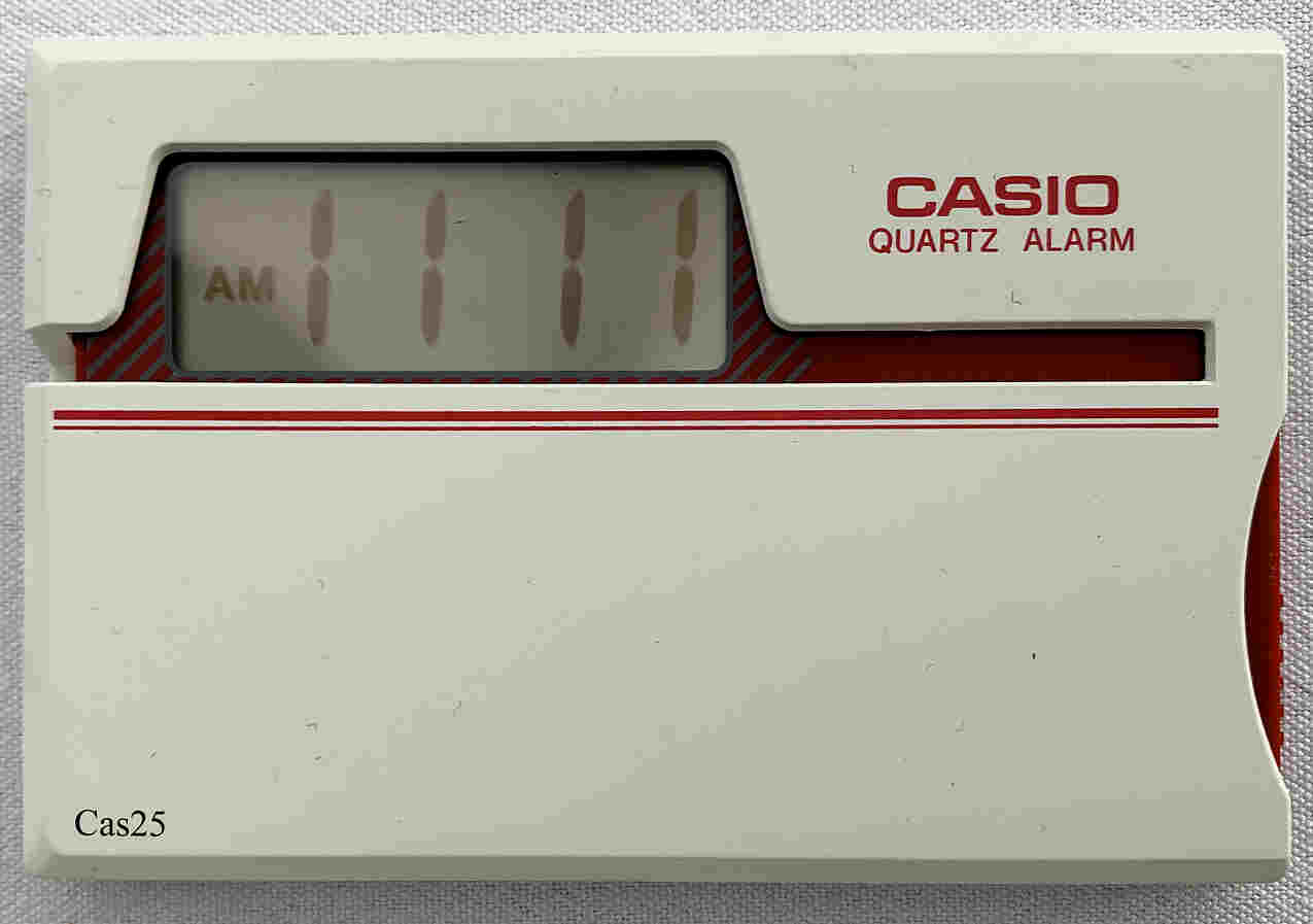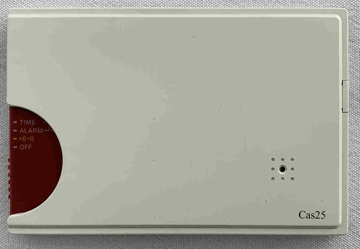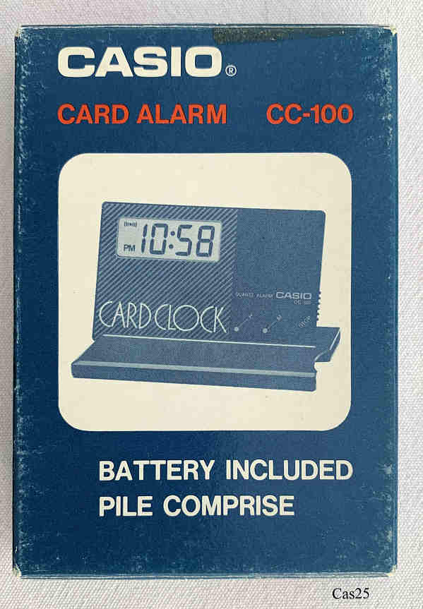 Eine Digitaluhr von Casio mit Wecker in der Form einer Scheckkarte. Kunststoff Gehäuse 3mm dick. Beschriftet vorn: ”Card Clock, Casio, Quartz Alarm CC-100.”, hinten: ”Made in Japan”.