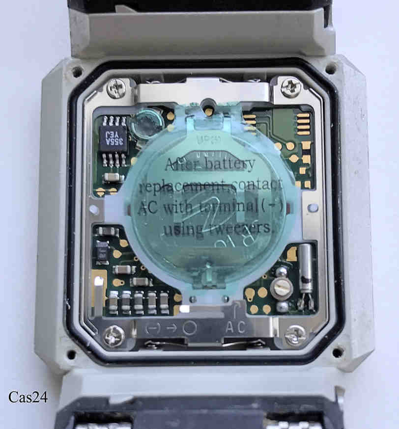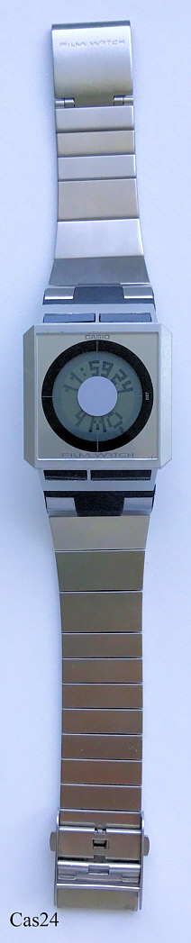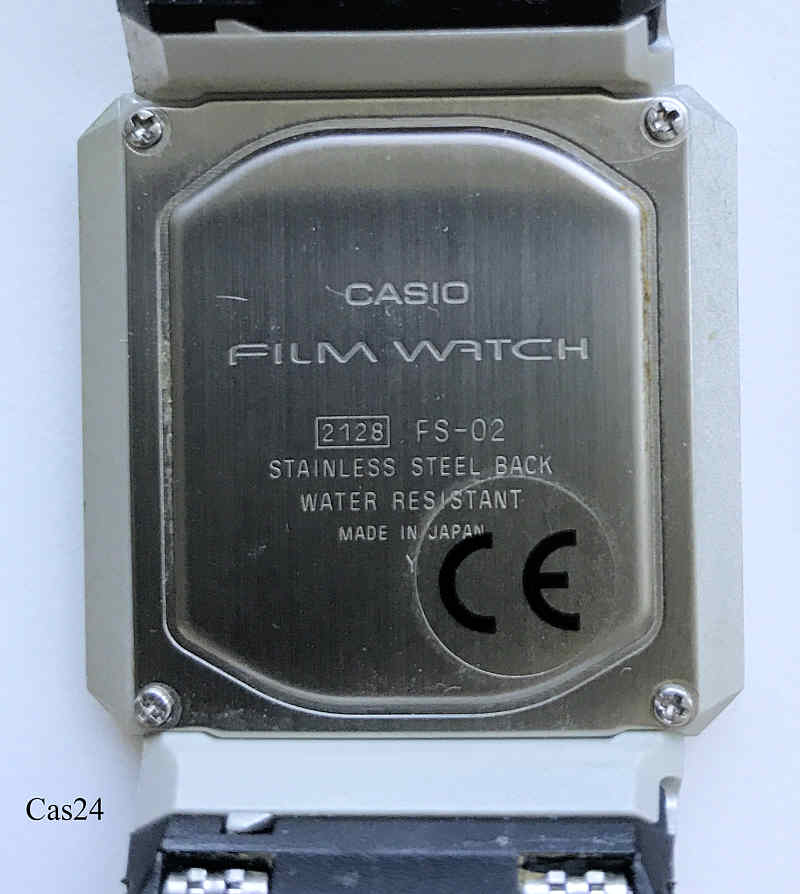 Dies ist eine flache Uhr von Casio mit einem Zifferblatt aus e-Ink Papier und Edelstahl Armband. Beschriftung vorn: ”Casio, Film Watch”, hinten: ”Casio, Film Watch, 2128, FS-02, Stainless Steel Back, Water Resistant, Made in Japan”, FS-02, verschraubter Boden.