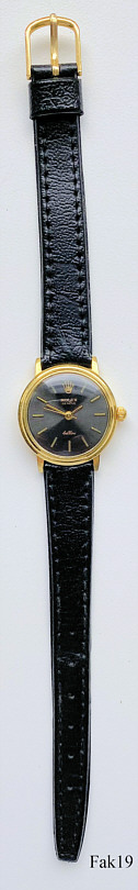 Dies ist ein Rolex Cellini Nachbau, vermutlich aus China. Ausgerüstet mit einem einfachen SIS PC21S Quartzuhrwerk. Beschriftet vorn: ”Rolex, Geneve, Cellini.”, innen: ”No Jewels, Unadjusted, Singapore, SIS, PC21S”, hinten: “ROLEX” , Schwarzes Lederarmband.
