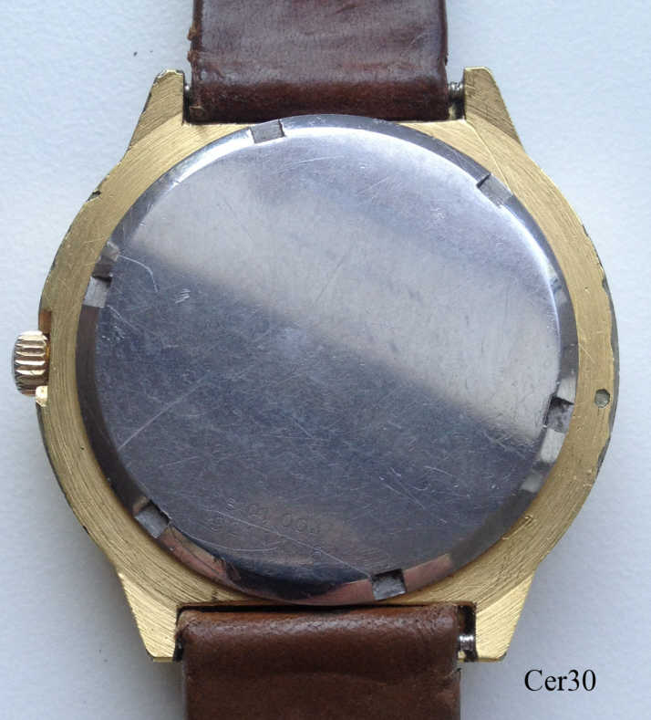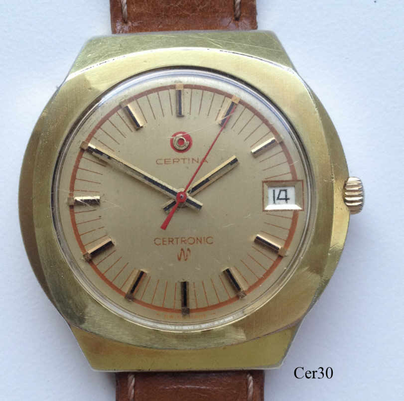 Dies ist eine Certina Certronic Stimmgabeluhr mit Kalender in vergoldetem Gehäuse, Caliber 29-151, ESA 9162, mit braunem Lederarmband. Beschriftet vorn: ”Certina, Certronic”, innen: ”Certina, Certronic, 29-151, unadjusted”, hinten: ”921 14 70, 8101 004”.