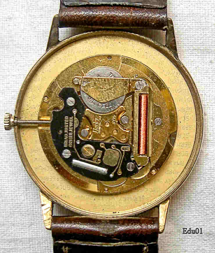 A very nice, flat quartz watch of the label “Champ de Coeur”, sold by Eduscho. Goldtone dial and brown leather band. Signed front: ”Champ de Coeur, Quartz, Swiss Made”, back: ”8K, 0,333”, inside: ”No Jewels, Harley Ronda, 3775”. Caliber Harley Ronda 3775.