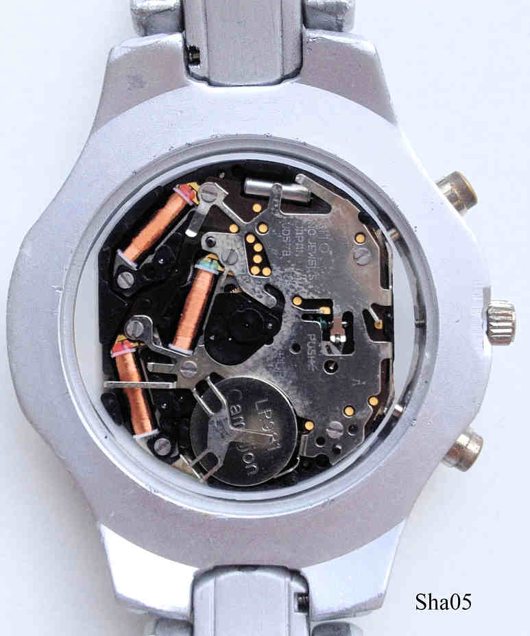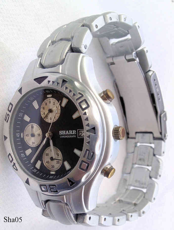Ein Sharp Chronograph mit sehr leichtem (Alu?) Gehäuse und Stainless Steel Back. Schwarzes Zifferblatt mit silbernen Chronoskalen. Datum bei der 3, Beschriftung vorn: ”Sharp, Chronograph”, Rückseite: ”CE, Sharp, 5 ATM, Water Resistant, Stainless Steel Back”, innen: “SIIO, No Jewels, Japan, VD57B”. Kaliber SIIO VD57B, leichtes Metall Gliederarmband