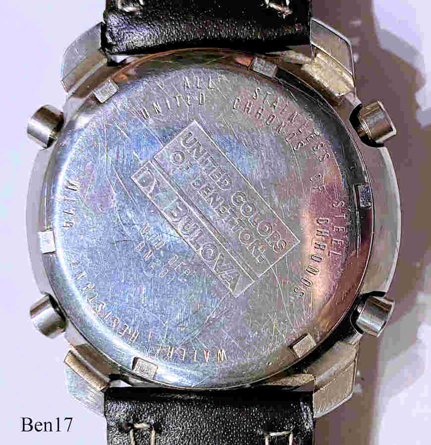 Ein Benetton by Bulova Chronograph, Beschriftet vorn: ”United Colors of Benetton, by Bulova”, hinten: ”United Colors of Benetton, by Bulova. Mod. Dep. BN201, All Stainless Steel, United Chronos of Chronos, Water Resistant 5 ATM”, innen: “Miyota Co., No Jewels, 6W50, Japan”. Schwarzes Lederarmband mit neutraler Schließe.