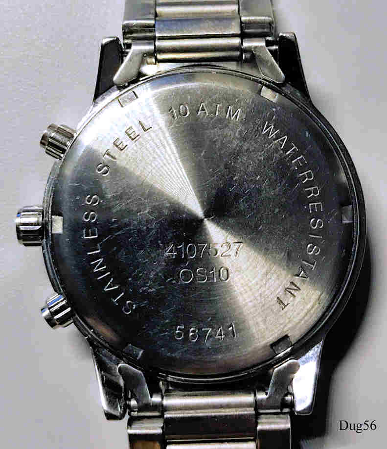Ein Dugena Chronograph mit Edelstahl Gehäuse und Stainless Steel Back. Kaliber Miyota OS10, Datum bei der 3, Beschriftung “ Dugena, Chronograph, WR100”, hinten: “Stainless Steel, 10ATM, Waterresistant, 4107527, OS10, 56741”, innen: “Miyota Co., OS10, No Jewels, Japan”, Kal. OS10. Schraubkrone und Minutenring, Dugena Edelstahl Armband mit Dugena Schließe.