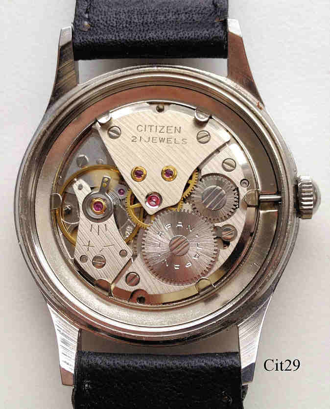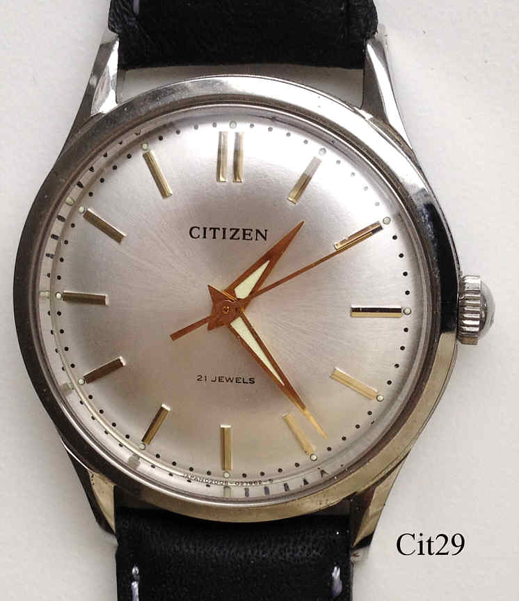 Dies ist eine Citizen Handaufzugs Uhr, Citizen Caliber 0200, Beschriftet vorn: ”CITIZEN, 21 Jewels”, innen: “Citizen, 21 Jewels”, Rückseite: ”Citizen, 0200, 4-022513-K, Stainless Steel, 30602449, 63-4289”, Edelstahl Gehäuse, schwarzes Lederband mit Citizen Schließe.
