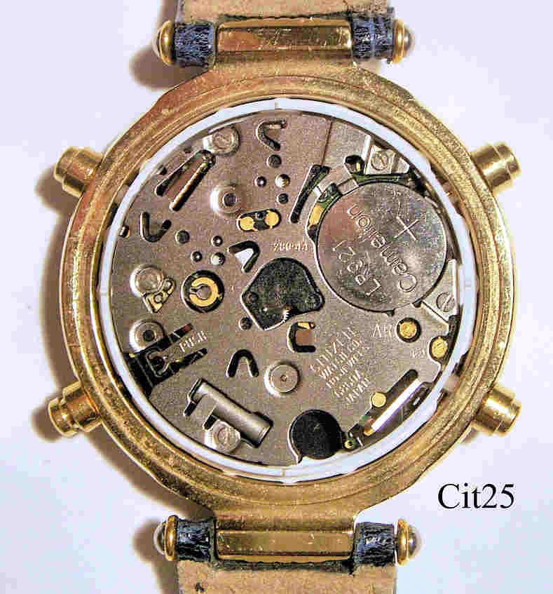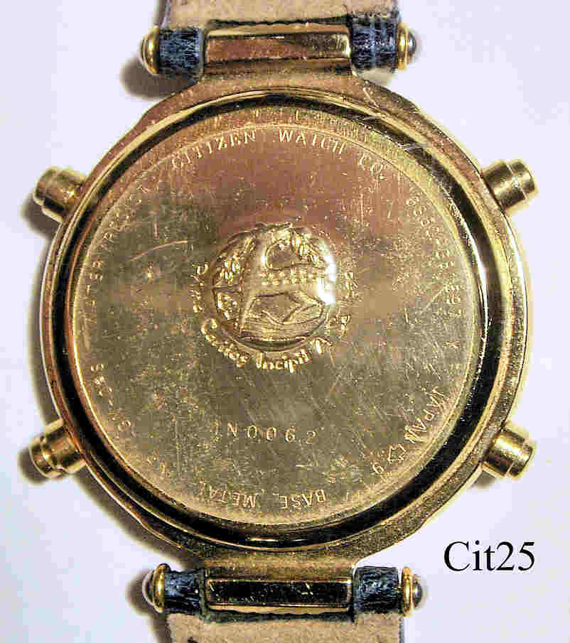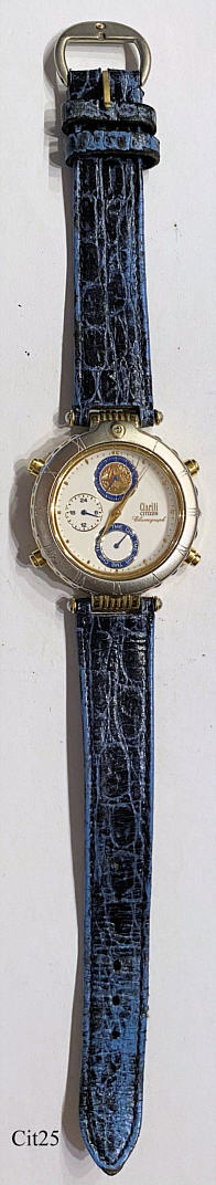 Ein Citizen Damen Chronograph mit Base Metal Gehäuse. Kaliber Citizen 6860 (Miyota 6860), Beschriftung vorn: ”Clariti, Citizen Chronograph”€¯, hinten: ”Citizen Watch Co., 6860-G6197 Y, 1N0062, Japan -> 9, Base Metal, GN-0-S, Water Resist” innen: ”Citizen Watch Co., No Jewels, 6860A, Japan”€¯. Blaues Leder Armband mit Citizen Schließe.