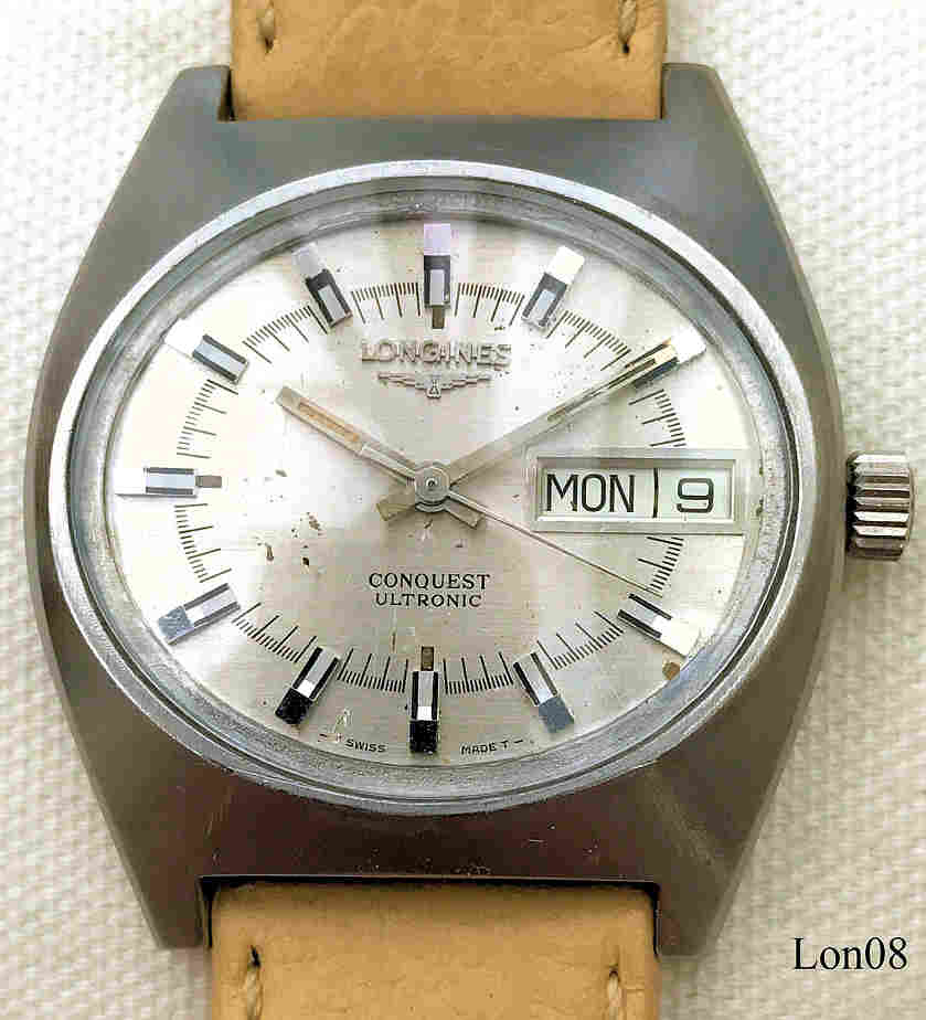 Dies ist eine Longines Conquest, Werk N° 51273531, Caliber 6332, ESA 9164, Edelstahl Gehäuse, geklemmter Edelstahlboden. Beschriftet vorn: ”Longines, Conquest, Ultronic”, hinten: ”Stainless Steel, 16860666”, innen: “Longines, 6332, 51273531, unadjusted, Twelve 12 Jewels”