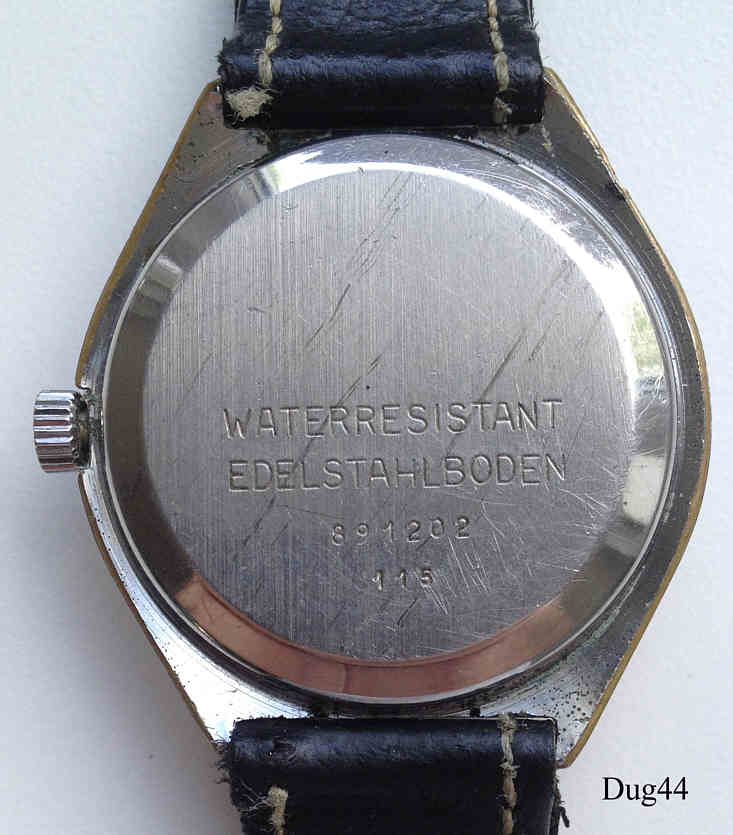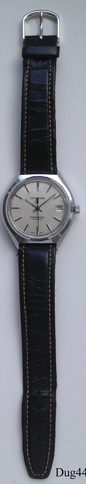 Eine frühe Dugena Herren Quartzuhr mit Base Metal Gehäuse und Stainless Steel Back, Kalender bei der 3. Kaliber Dugena 5061, entspricht dem SSiH 5500. Beschriftung vorn: “Dugena, Continental, Quartz”, hinten: ”Water Resistant, Edelstahlboden, 891202, 115”, innen: ”Dugena 5061, Unadjusted, Three 3 Jewels, SSiH 5500, Swiss, 706A”. Schwarzes Lederarmband mit neutraler Schließe.