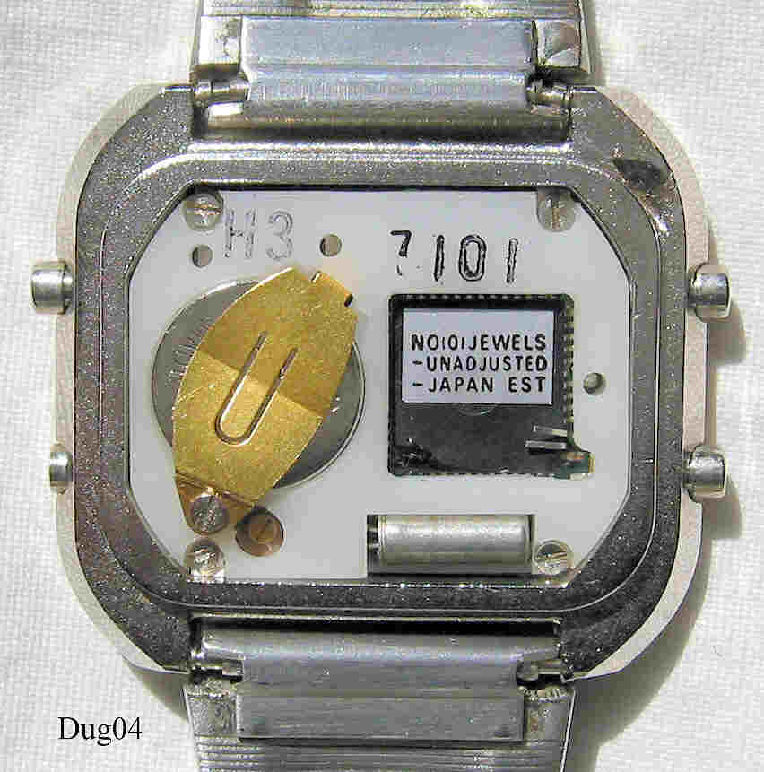 Ein Dugena LCD Uhr mit Base Metal Gehäuse und Stainless Steel Back. Beschriftung vorn: “Dugena, Continental Quartz”, hinten: ”Base Metal Bezel, Swiss Made Case, Steel Back, SMSA, 3611, 86906,3 115l”, innen: “No Jewels, Unadjusted, Japan EST” Alle Anzeigen erfolgen auf einem LCD Display, Stunden, Minuten, Sekunden. Edelstahl Armband mit Dugena Schließe.