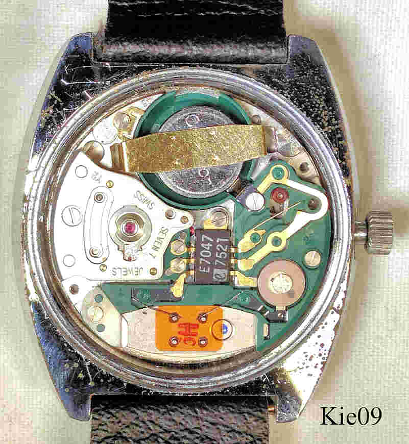 Dies ist eine Kienzle Chronoquartz Uhr mit dem ESA 9181 Werk. Beschriftet: ”Kienzle, Chronoquartz, Water Resistant”, Rückseite: ”Automatic, Waterprotected, Antimagnetic, 523”, innen: “Unadjusted, Seven 7 Jewels, Swiss, Eta 9181”. Gehäuse Edelstahl, schwarzes Lederarmband. Caliber ESA 9181.