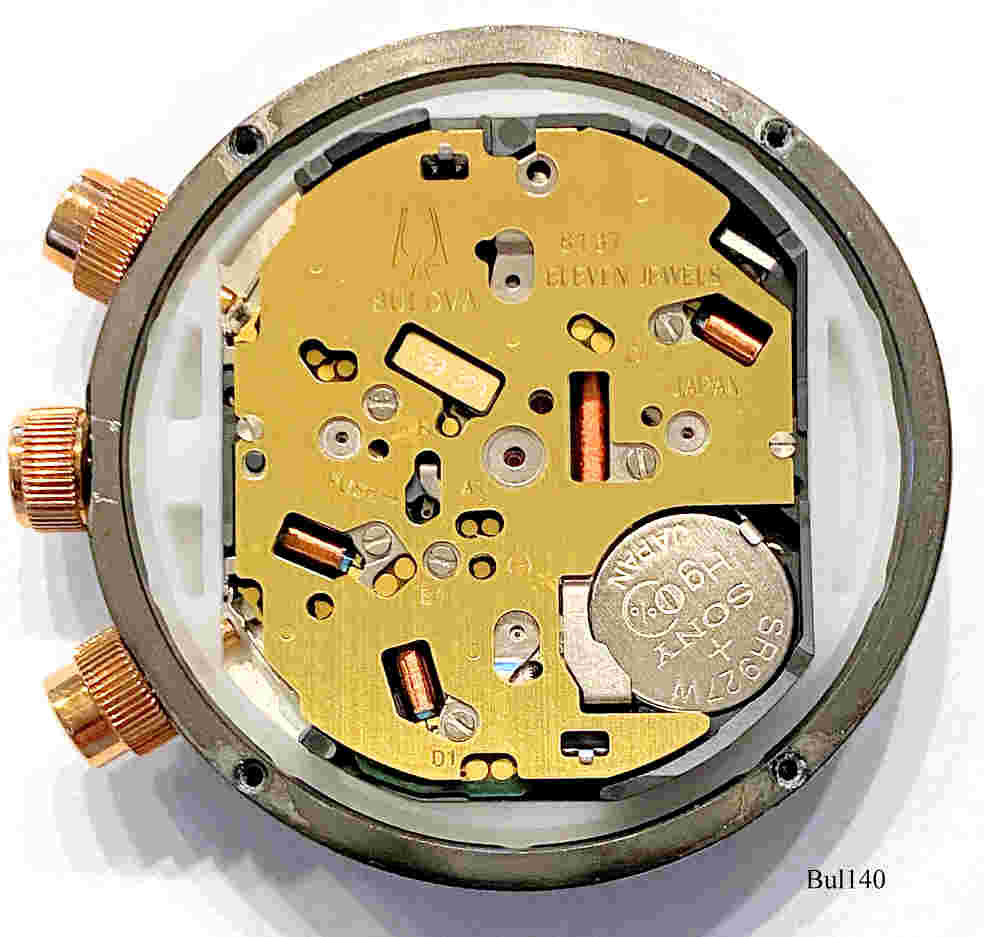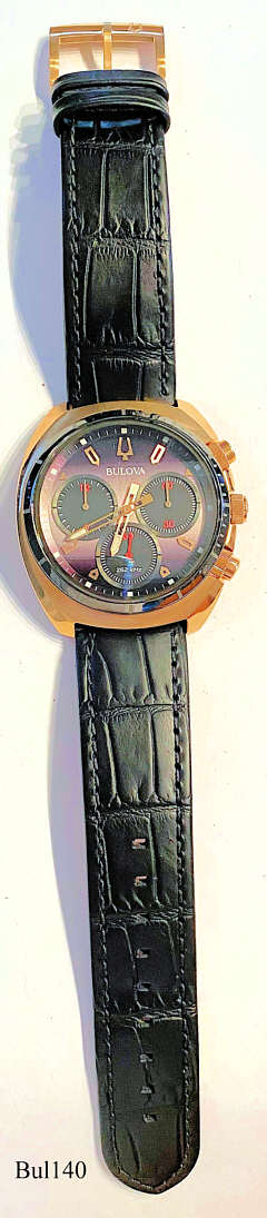 A Bulova Accutron II Chronograph with a 262 KHz quartz movement. Signed front: ”Bulova, 262 KHz”, back: “High Performance Quartz, Bulova, B7, St.Steel, Water Resist, 21139342, 98A156, C477924, Japan Movement, China Band”, inside: ”Bulova, Japan, 8187, Eleven Jewels”. Datecode B7 = 2017, Movement 8187, Stainless Steel case , red gold plated. Black leather band with red gold clasp. As of bulova this is the very first curved quartz chronograph worldwide.