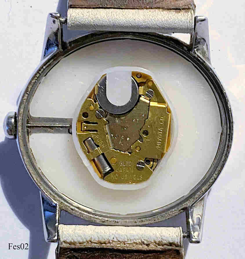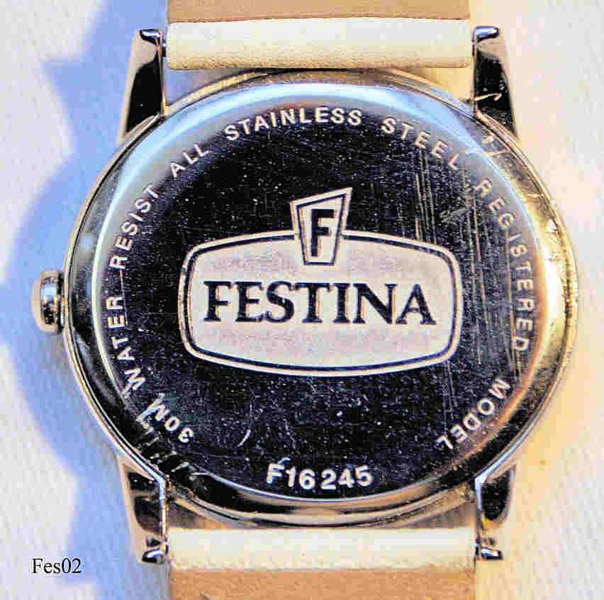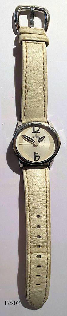 Dies ist eine Festina Damen Quartzuhr. Beschriftet vorn: ”Festina”, hinten: “Festina, 30M Water Resist, All Stainless Steel, Registered Model, F16245”, innen: “Miyota Co., GL30, Japan, No Jewels”, im Boden: “352108”.. Die Uhr hat ein ansprechendes Gehäuse in Edelstahl mit creme farbenem Lederarmband.