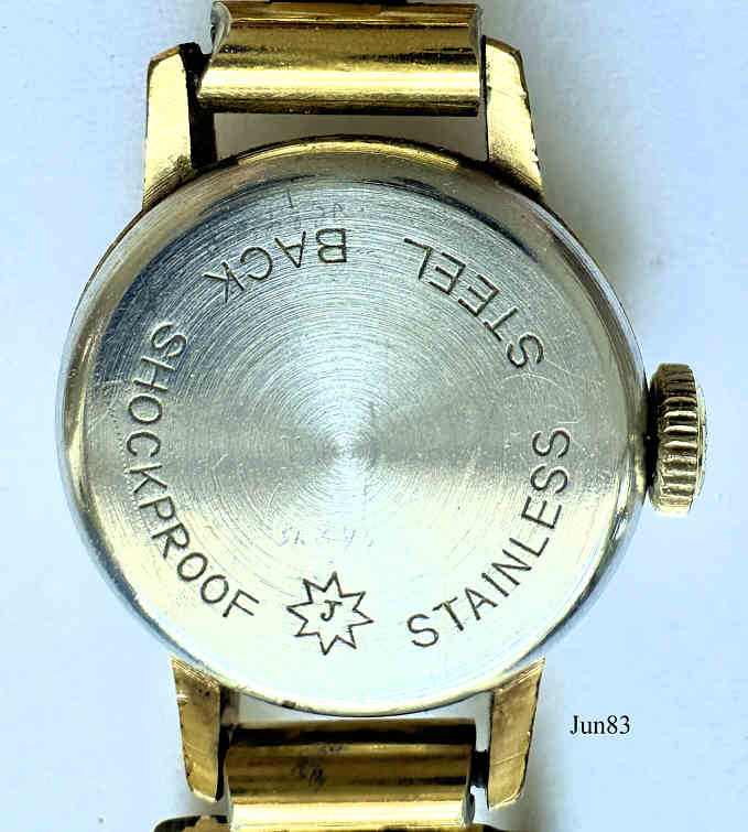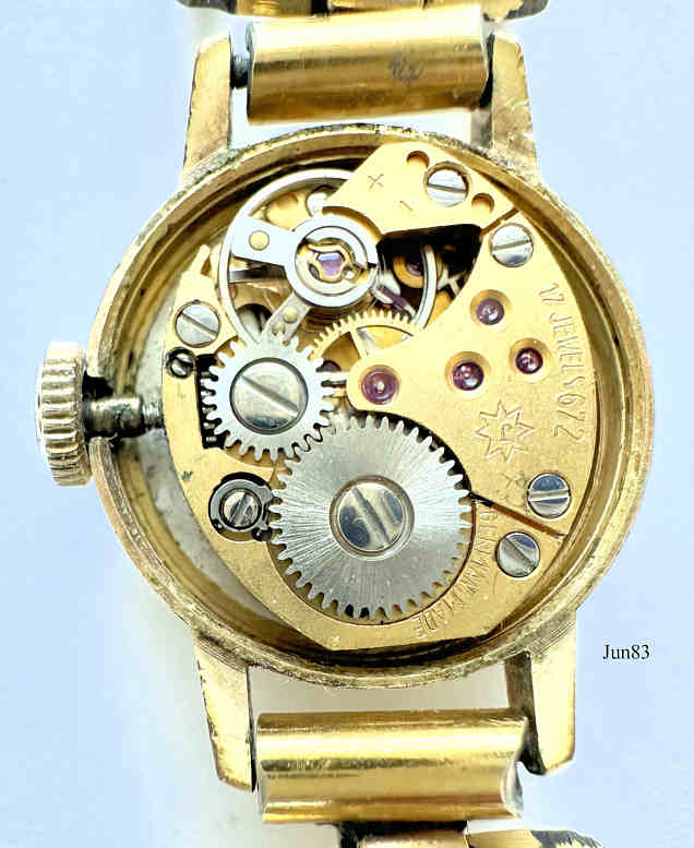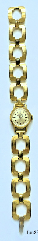 Eine sehr kleine Junghans Damenuhr mit dem Kaliber 672. Vergoldetes Gehäuse mit am Rand facettiertem Glas. Silbernes Zifferblatt mit Balken statt Zahlen und einfachen Strichzeigern. Beschriftet vorn: “J, Junghans, 17 Jewels”, hinten: “J, Stainless Steel Back, Shockproof”, innen: “J, 17 Jewels, 672, German Made”, spezielles goldfarbenes Metallarmband.
